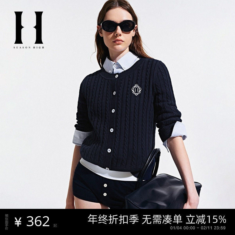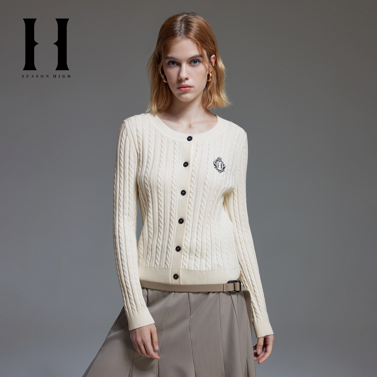 SEASONHIGH秋冬款女针织衫圆领修身罗纹毛衣刺绣纽扣门襟上衣女装