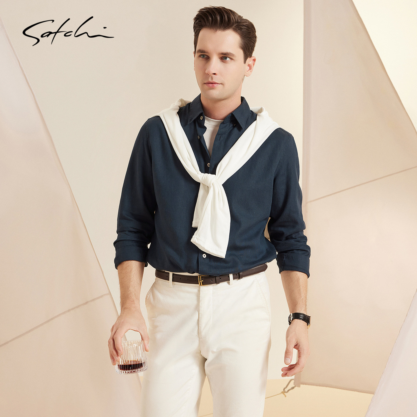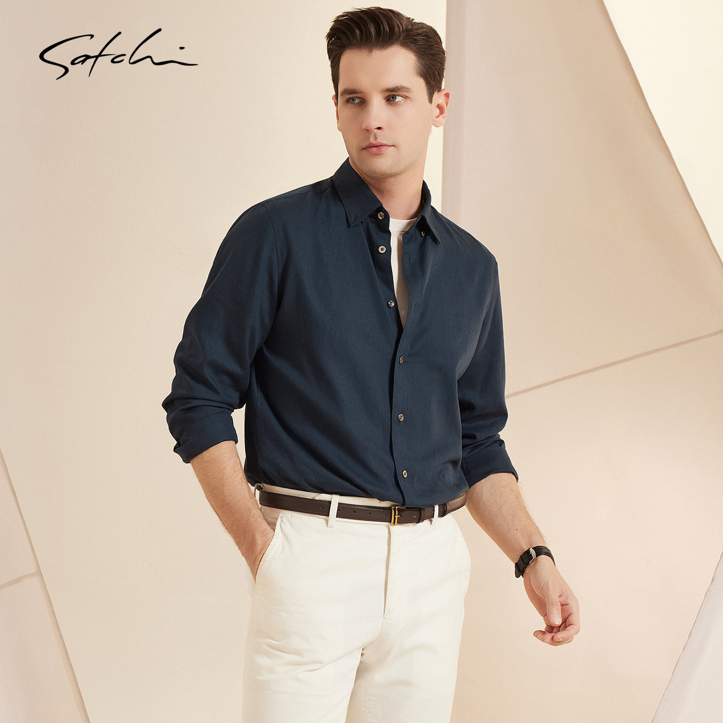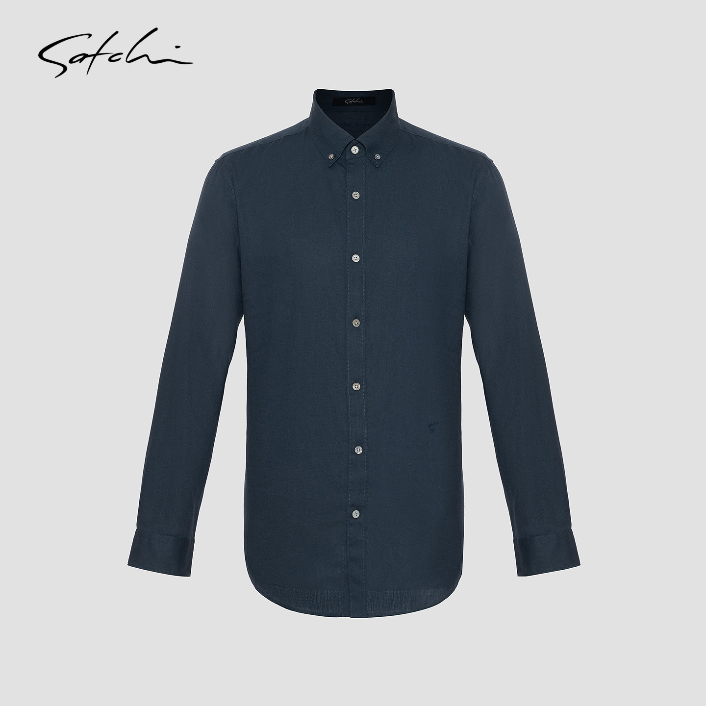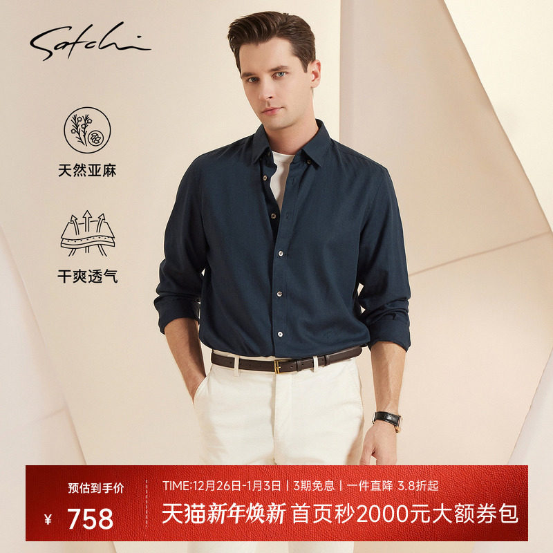 [亚麻]SATCHI沙驰男装男士长袖衬衫春季新款休闲老钱风复古衬衣薄