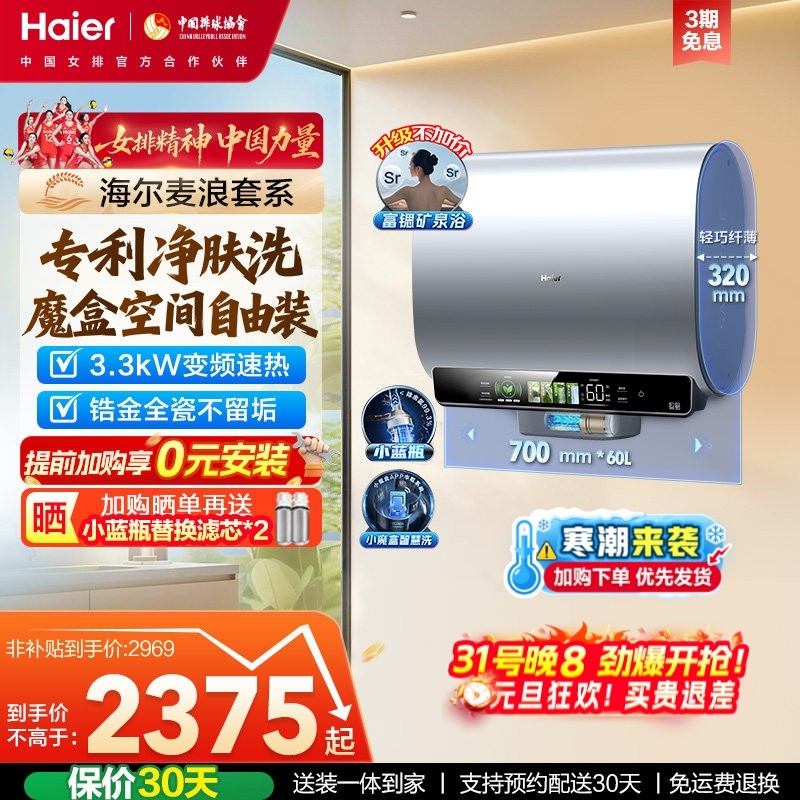 海尔麦浪电热水器家用扁桶双胆卫生间洗澡魔盒小蓝瓶BK5一级60升