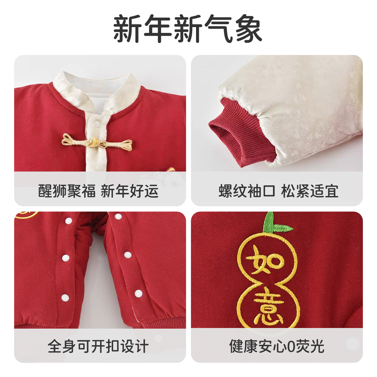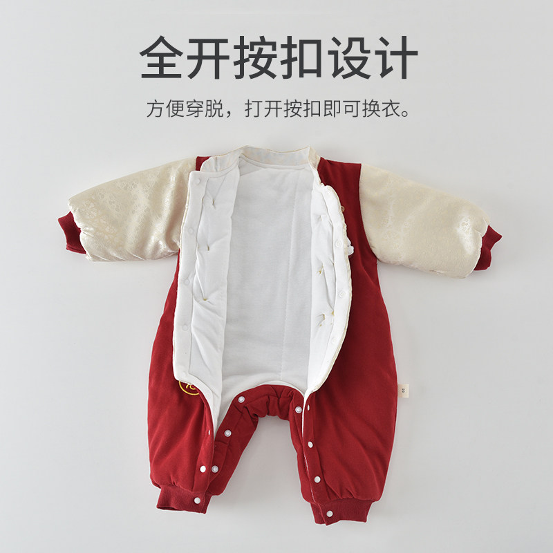 婧麒新生婴儿拜冬年服连体衣满月宝宝醒狮喜庆新年冬装外出抱抱服