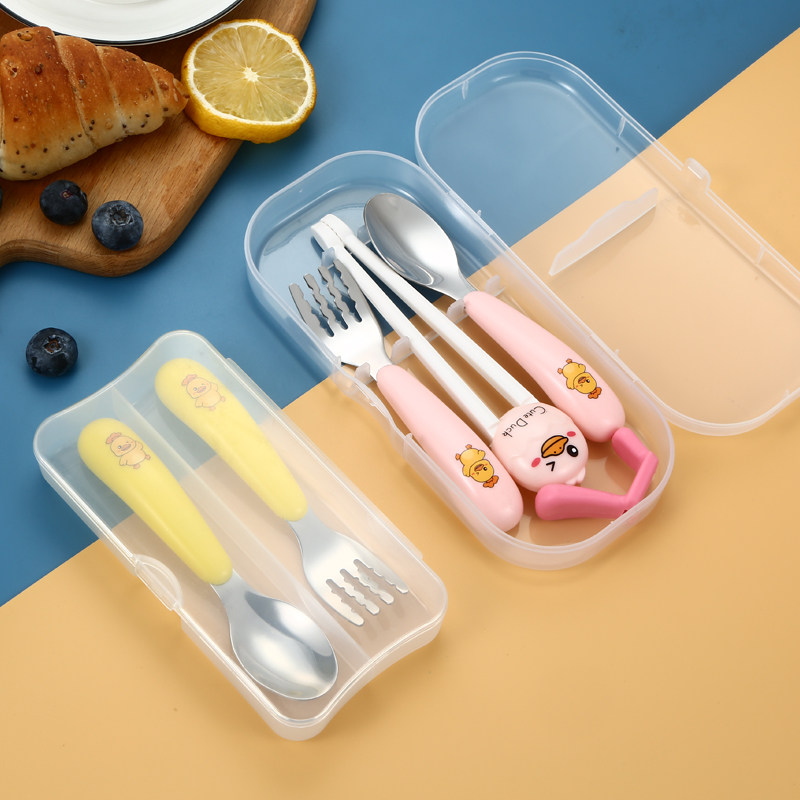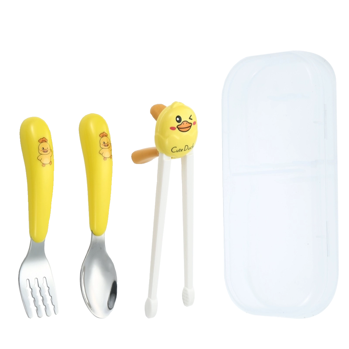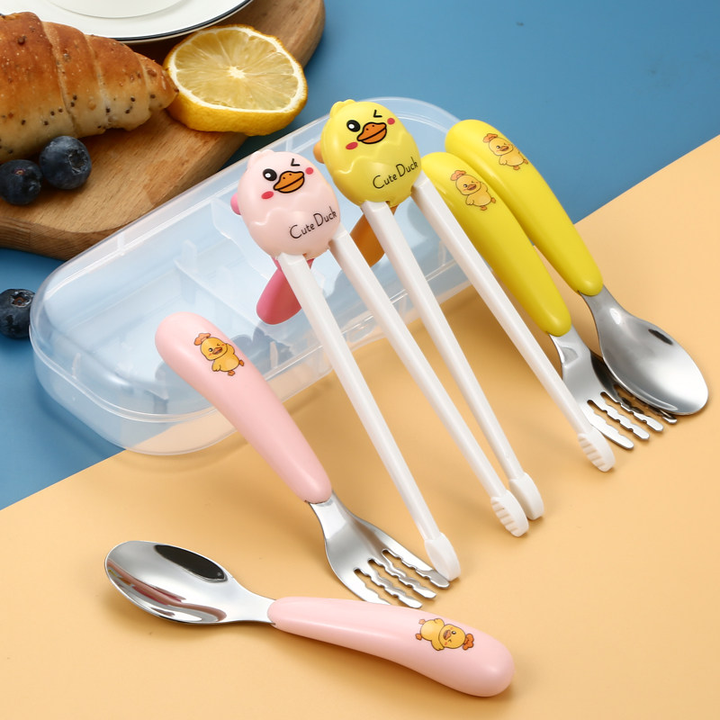小黄鸭304不锈钢儿童餐具勺叉回弹筷3件套宝宝家用吃饭训练勺子