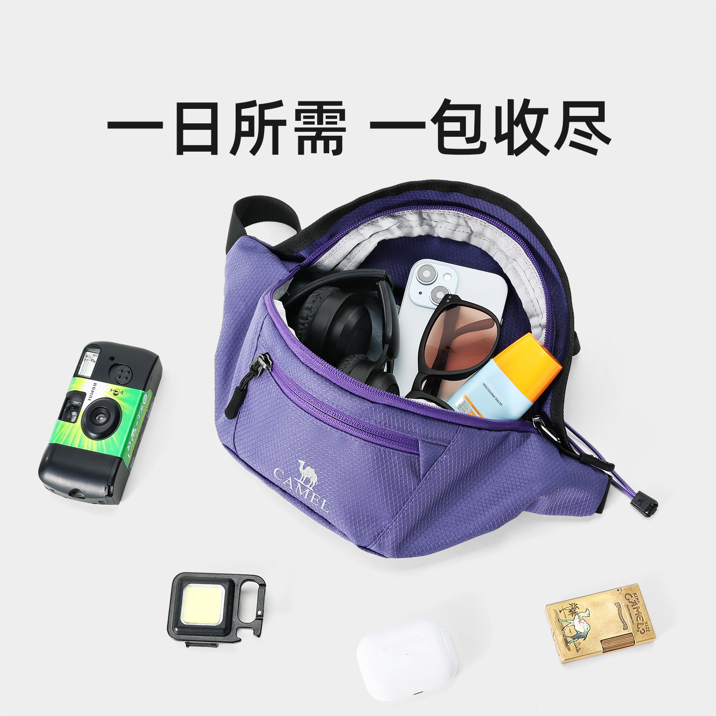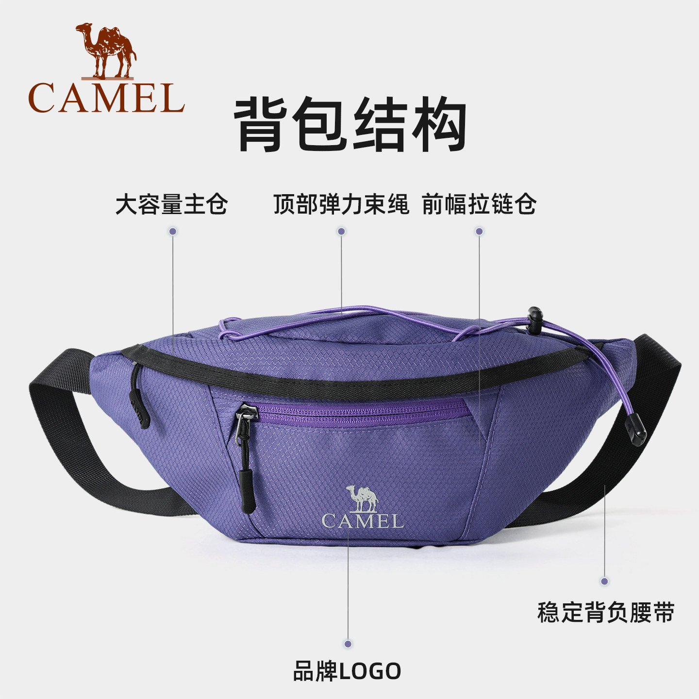 骆驼紫色多功能通勤跑步运动腰包男女士大容量便携胸包手机袋小包