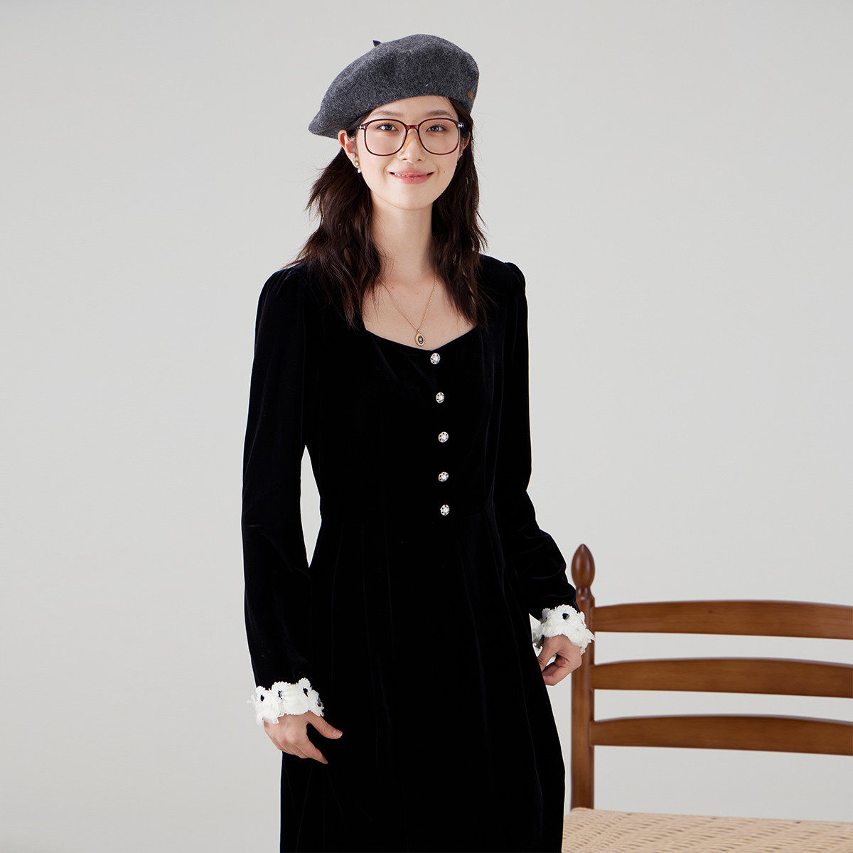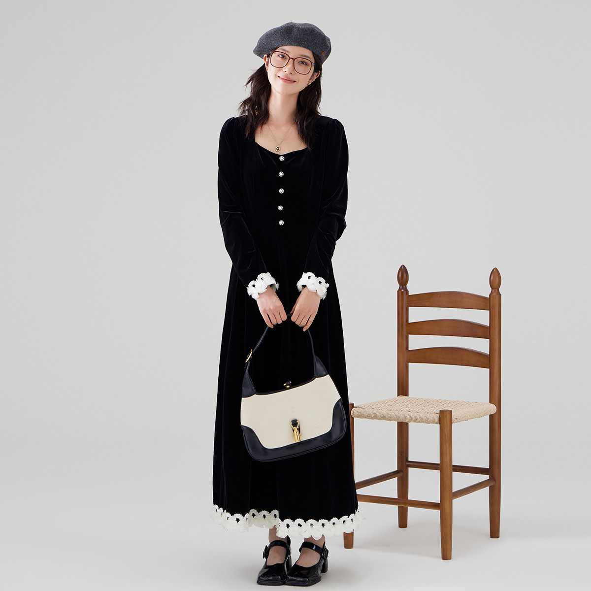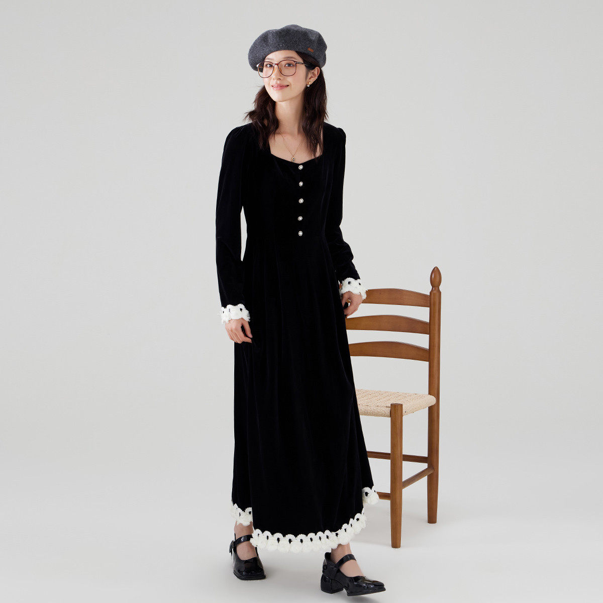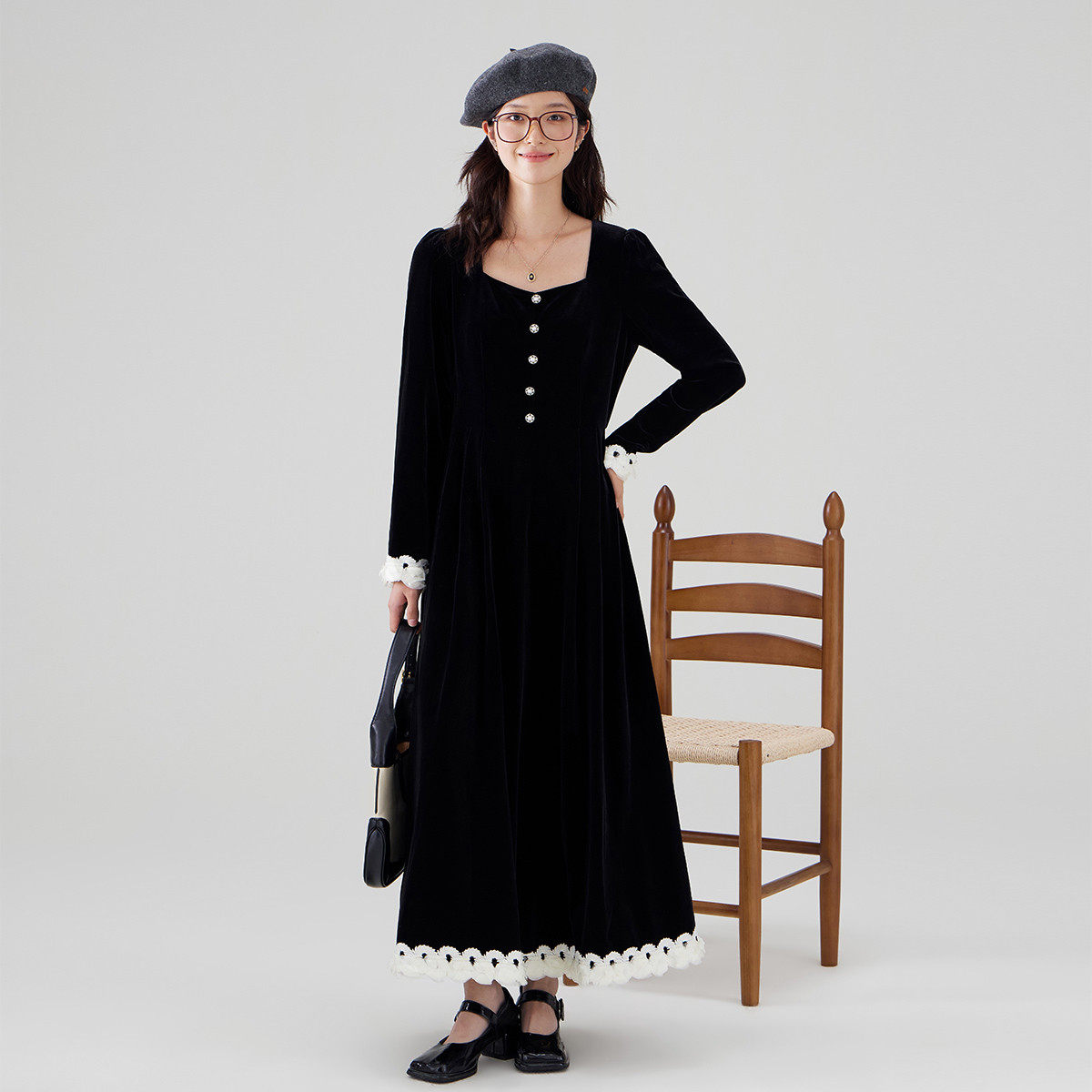 one more方领丝绒连衣裙女秋新款法式显瘦裙子高级感长裙年会礼服
