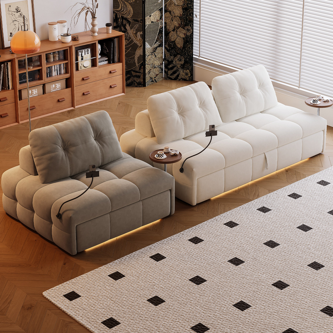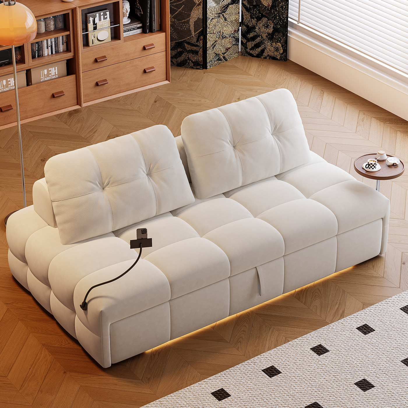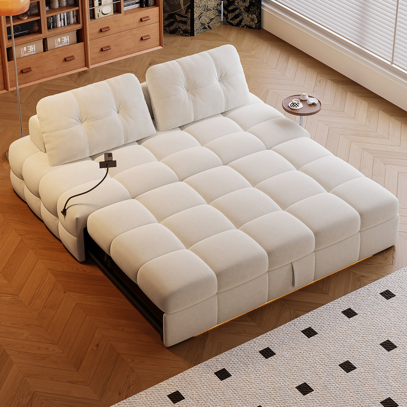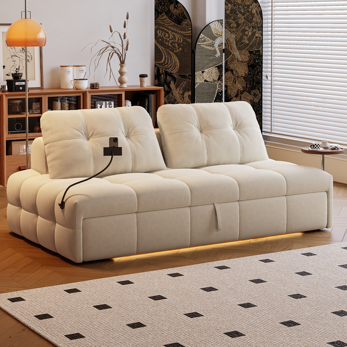司朴奶油风客厅可伸缩折叠两用沙发床小户型书房抽拉双人布艺沙发