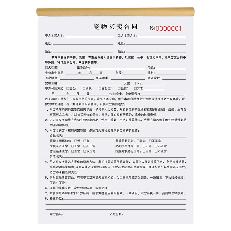 宠物买卖合同交易本猫狗美容登记表单据销售单宠物店寄养协议书