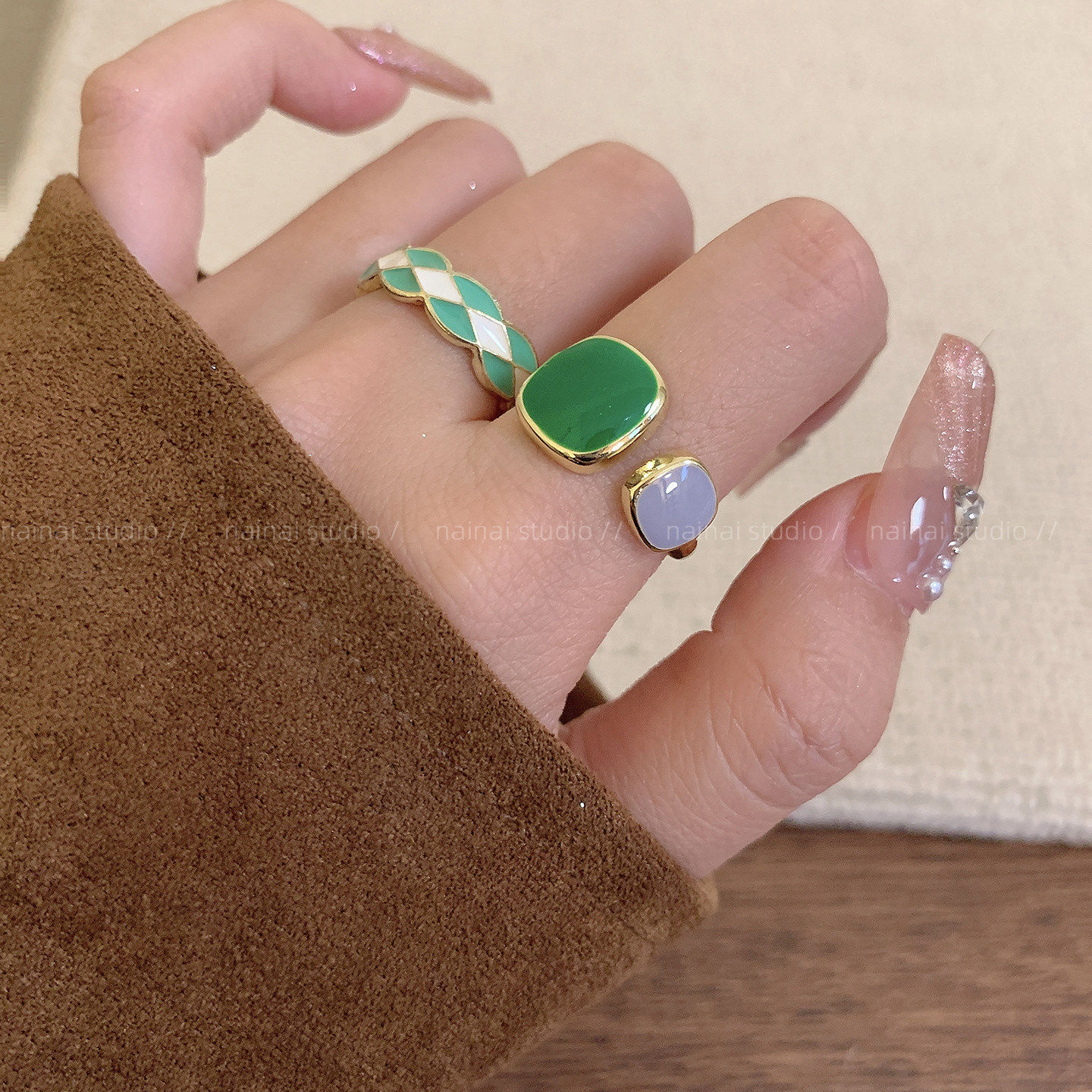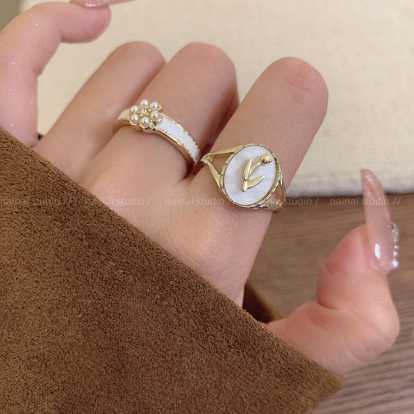 滴釉戒指集合~白色蝴蝶超仙珍珠双层花朵食指戒叠戴韩系ins指环A