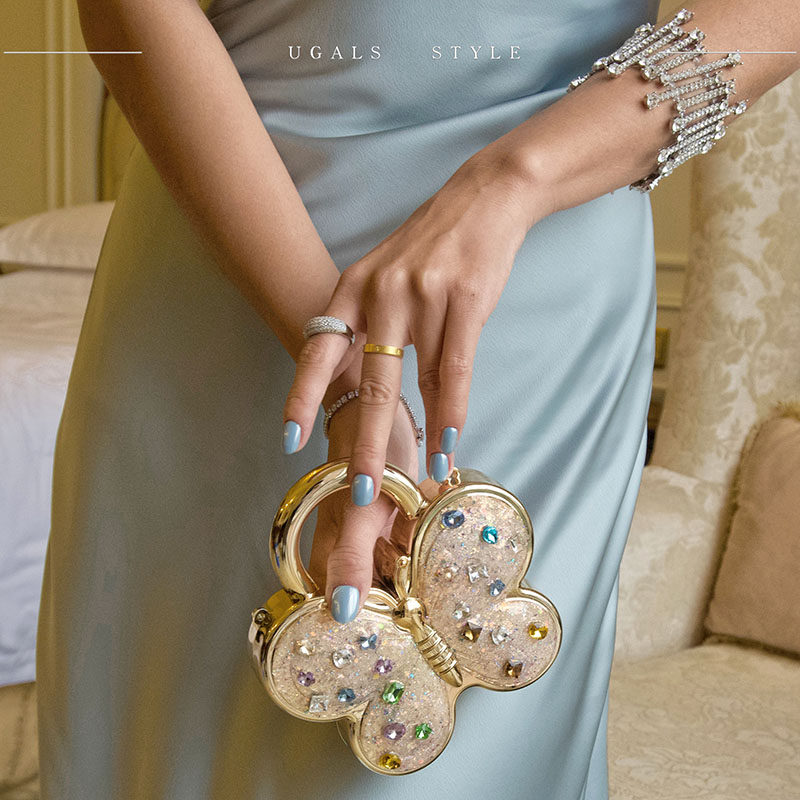 UGALS法式仙女甜美蝴蝶彩色水钻轻奢晚宴气质亚克力手拿斜挎小包