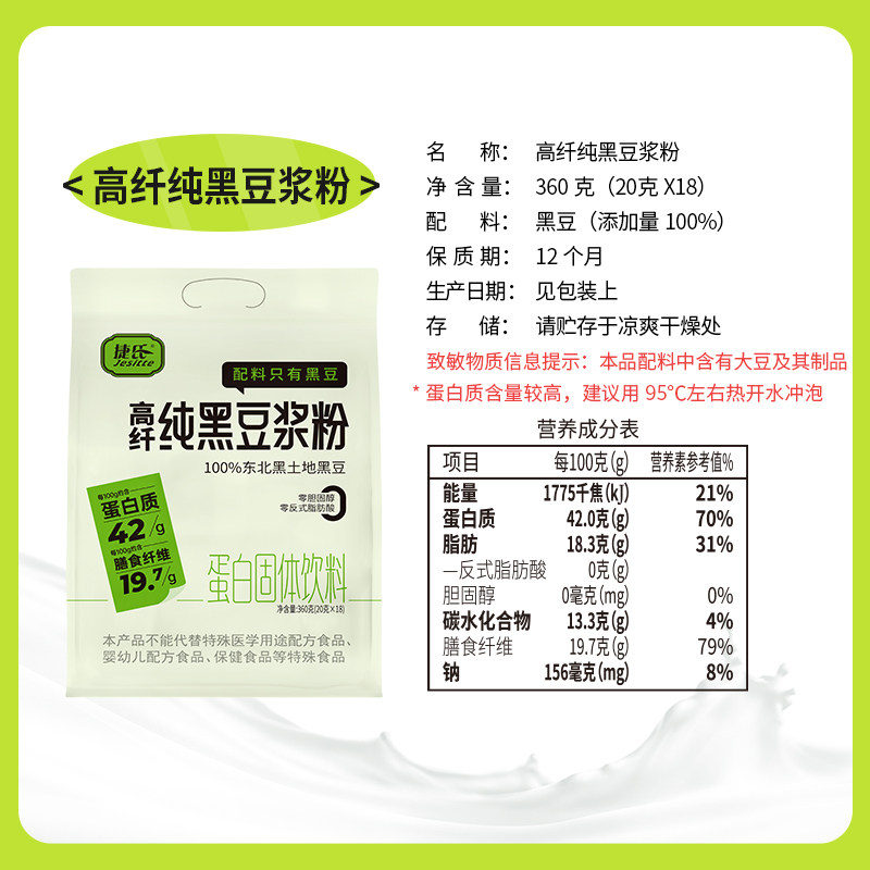 捷氏纯黑豆豆浆粉无添加糖高蛋白原味纯豆浆粉成人营养早餐孕妇