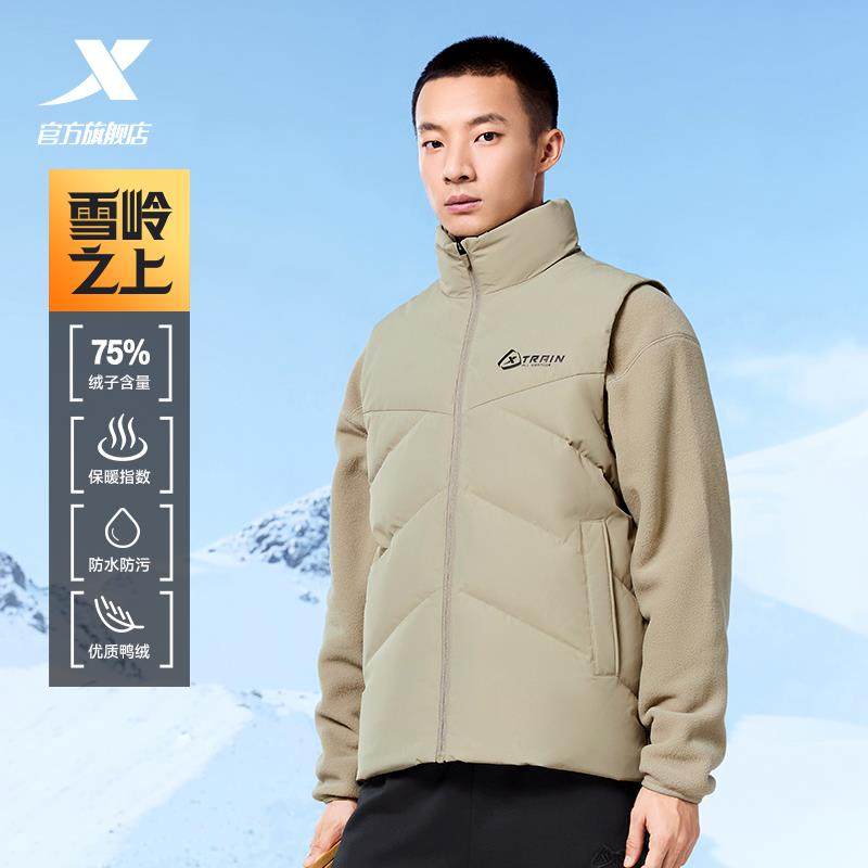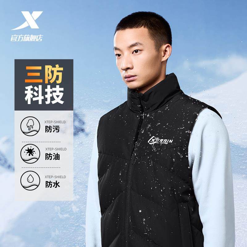 特步有暖气羽绒马甲男款2025年秋冬季新款保暖外套三防立领运动服
