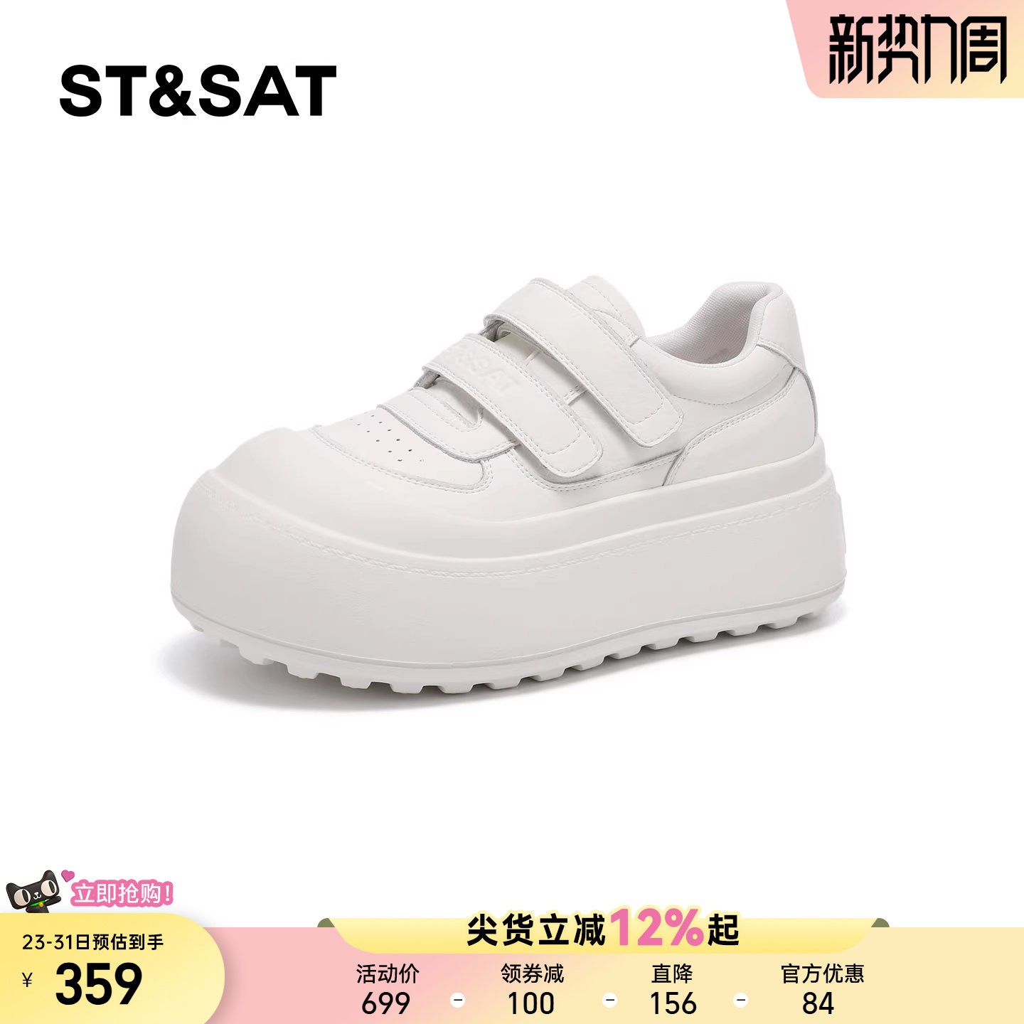 星期六厚底小白鞋女2026春季内增高休闲百搭板鞋魔术贴大头面包鞋