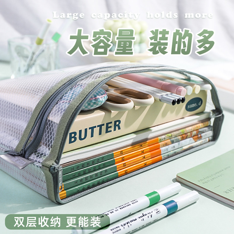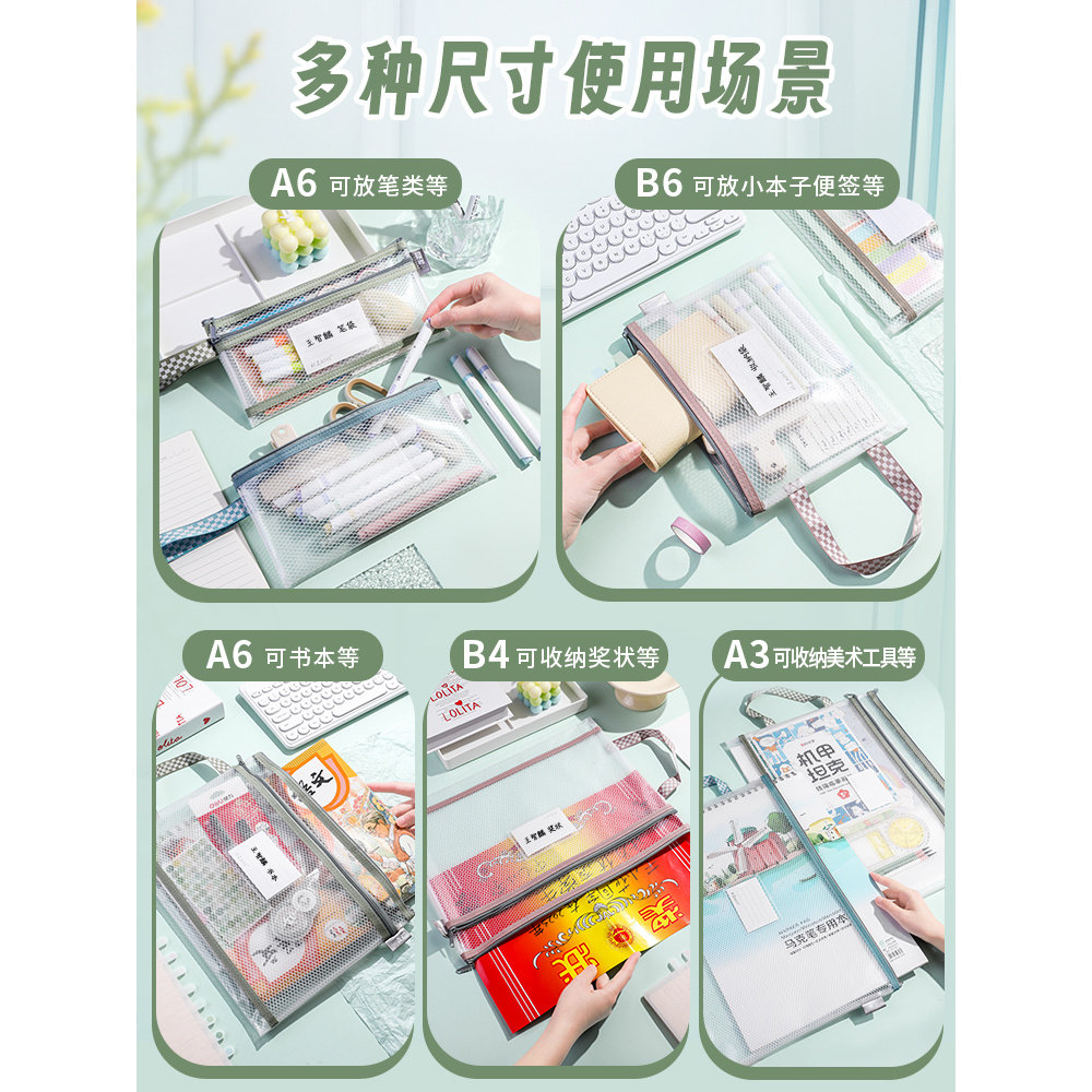 L型学科目分类袋透明网纱文件袋拉链大开口学生手提拎书袋考试用