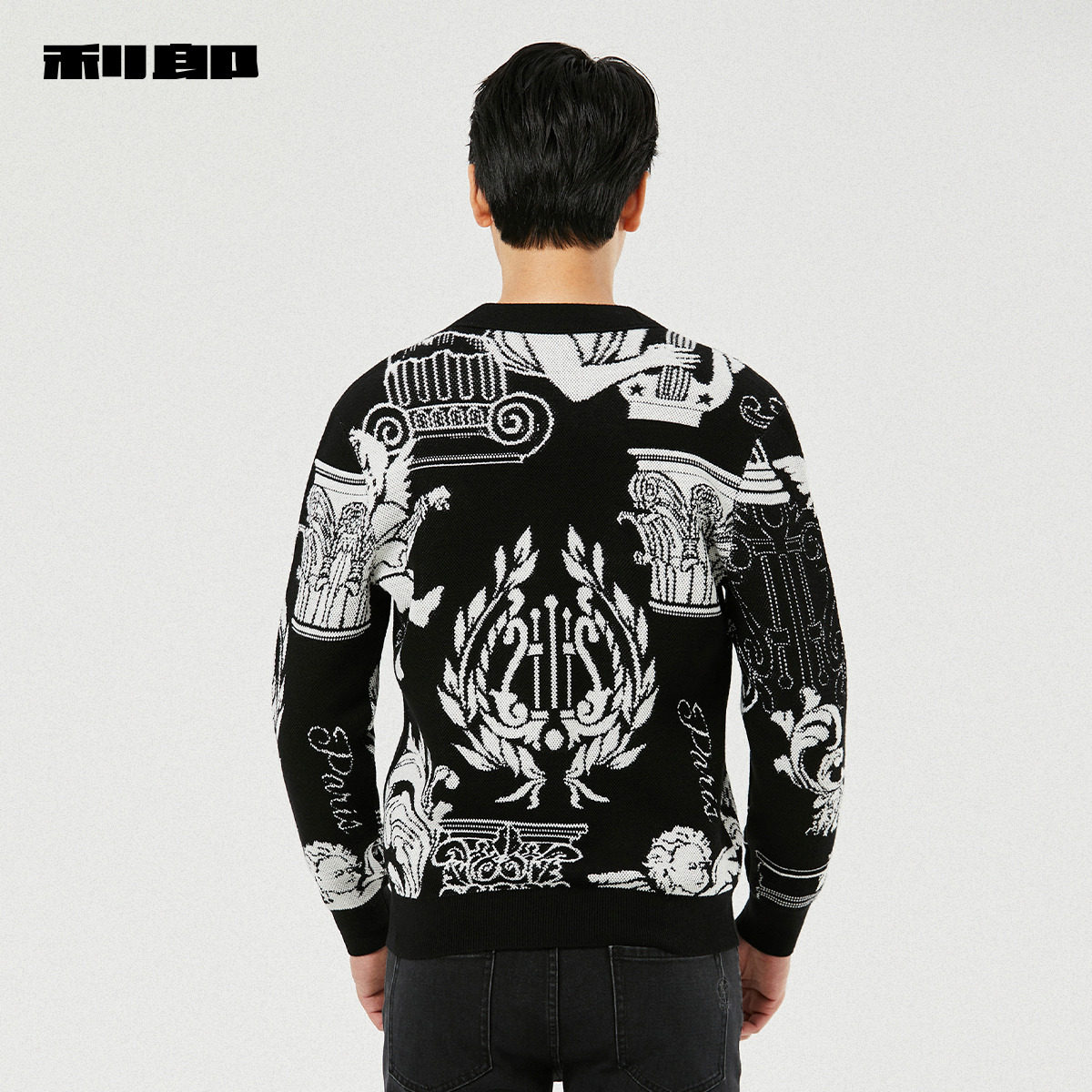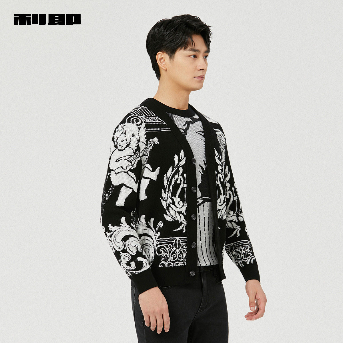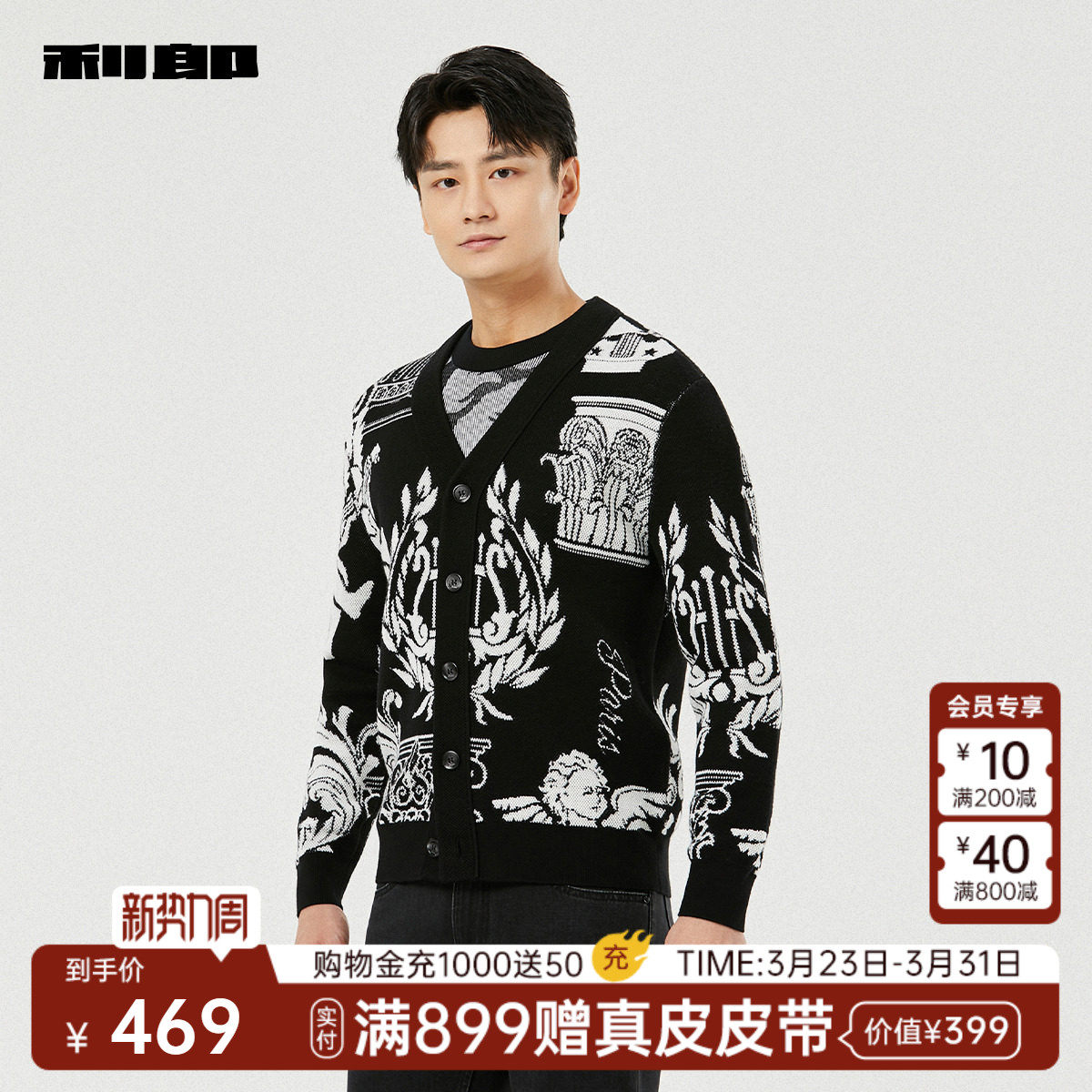 利郎官方 绵羊毛衫男士潮流休闲提花V领春秋款假两件长袖毛衣男