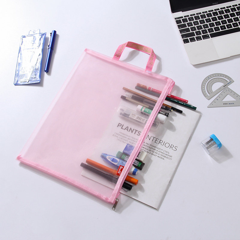 L型科目分类袋手提透明文件袋拉链式网纱大开口学生拎书袋考试