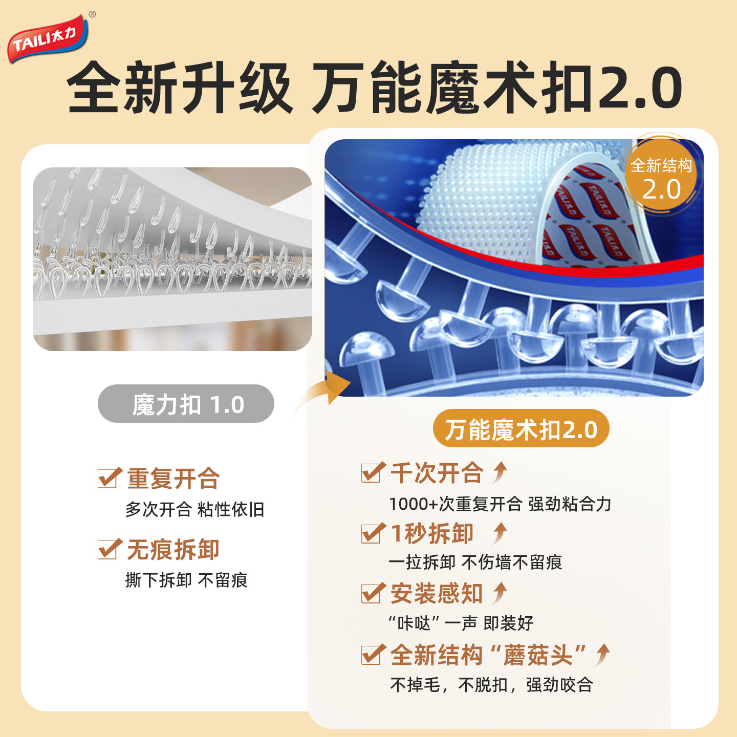 太力墙面无痕贴魔术贴带背胶乳胶漆专用魔术扣免打孔婚纱照片相框挂画固定神器魔力扣免钉双面胶可移除不伤墙