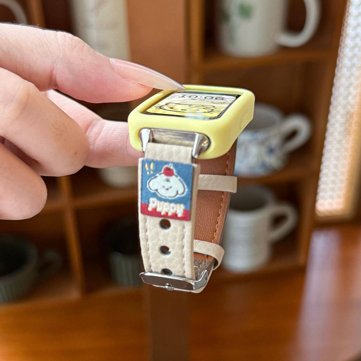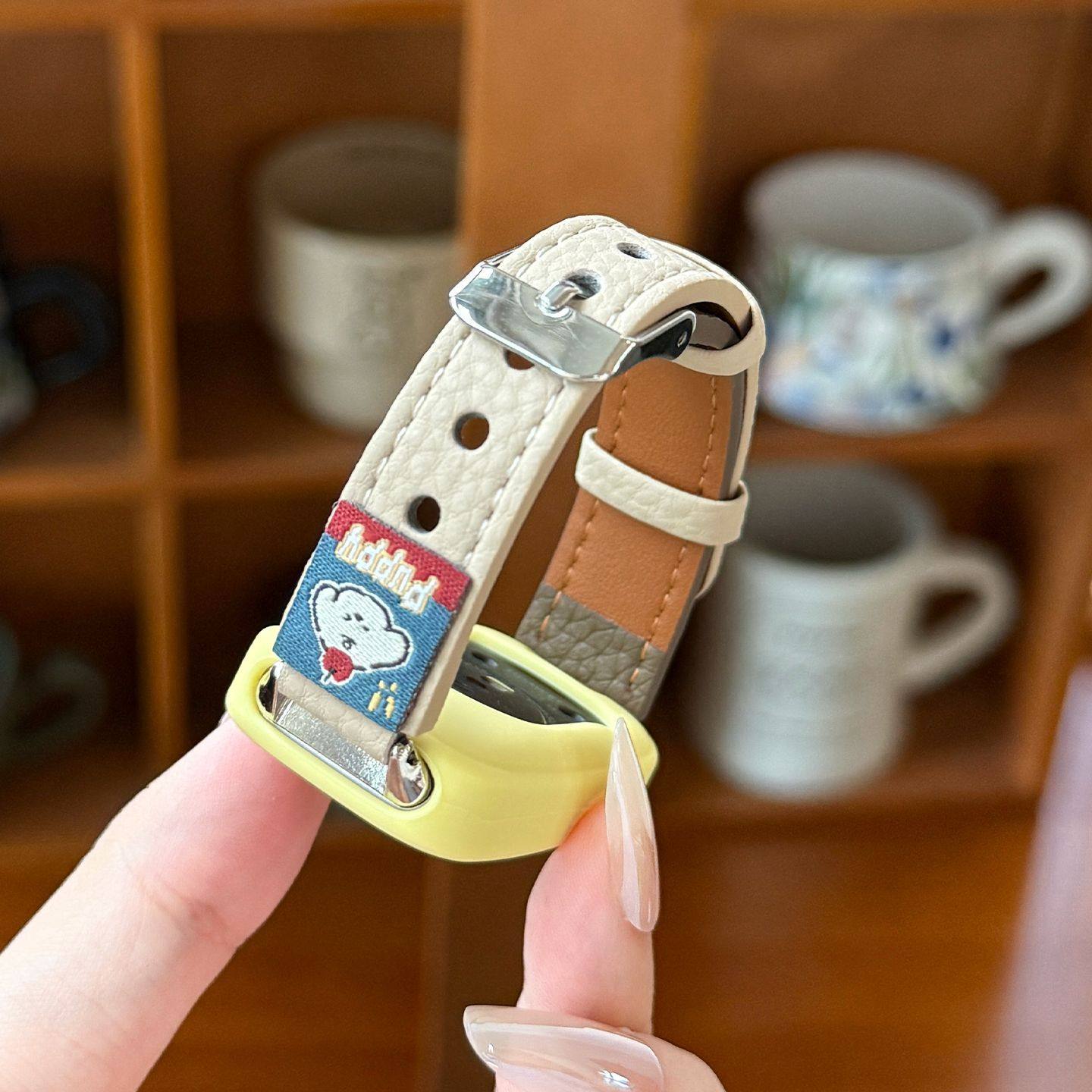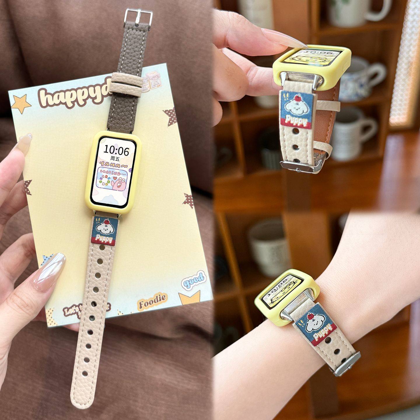 适用华为手环10表带新款9秋冬可爱猫布贴撞色荔枝纹皮质8创意7荣耀简约透气运动女百搭白色粉色