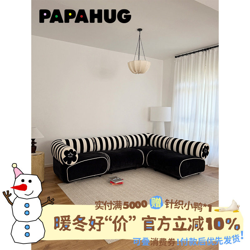 PAPAHUG 花花布艺沙发客厅三人位直排沙发豆腐块沙发中古转角沙发