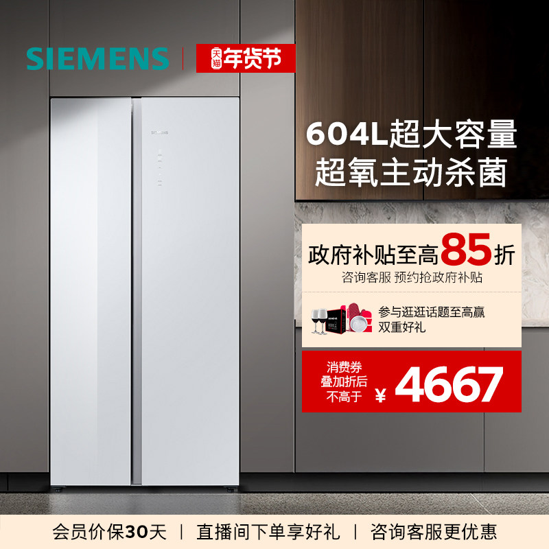 【新品主动杀菌】西门子玻璃面板604L大容量一级能效对开门冰箱