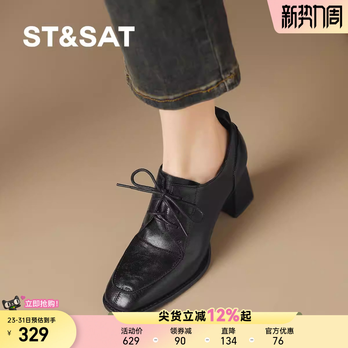 St&Sat/星期六复古通勤粗跟女春季新款系带深口单鞋英伦小皮鞋女