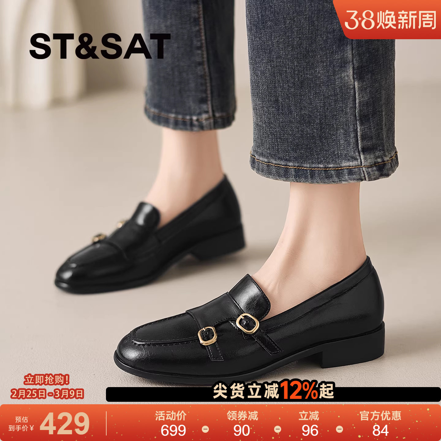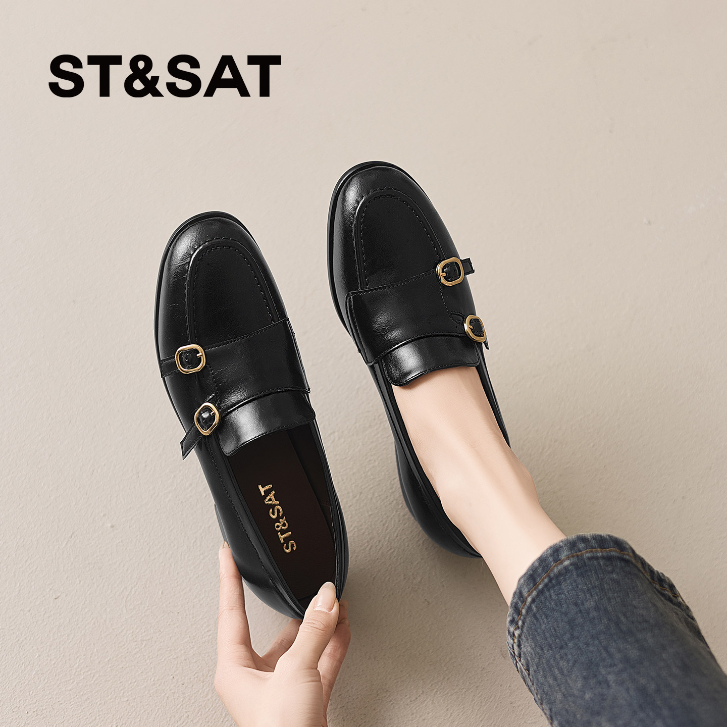星期六真皮乐福鞋女山茶花新款秋季女鞋平底单鞋英伦风黑色小皮鞋