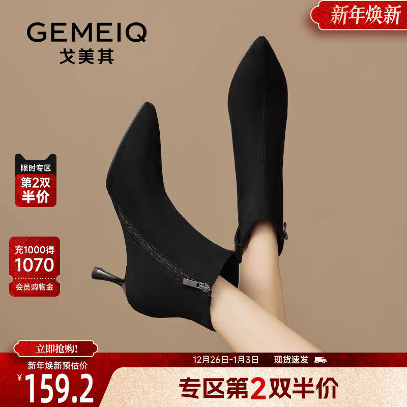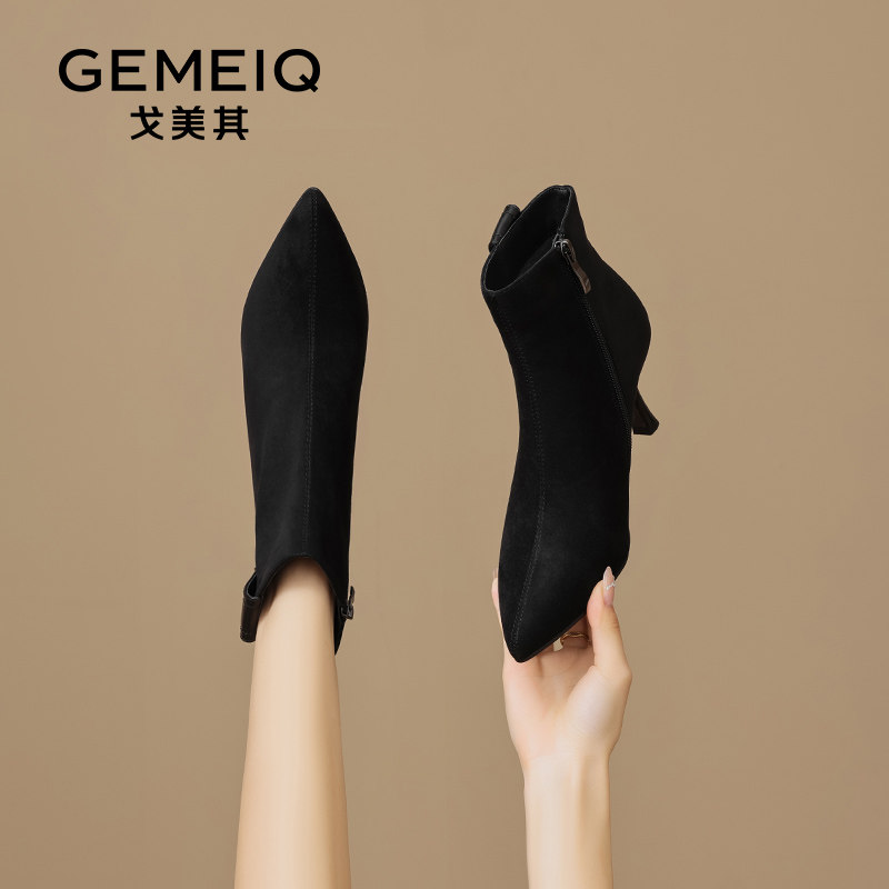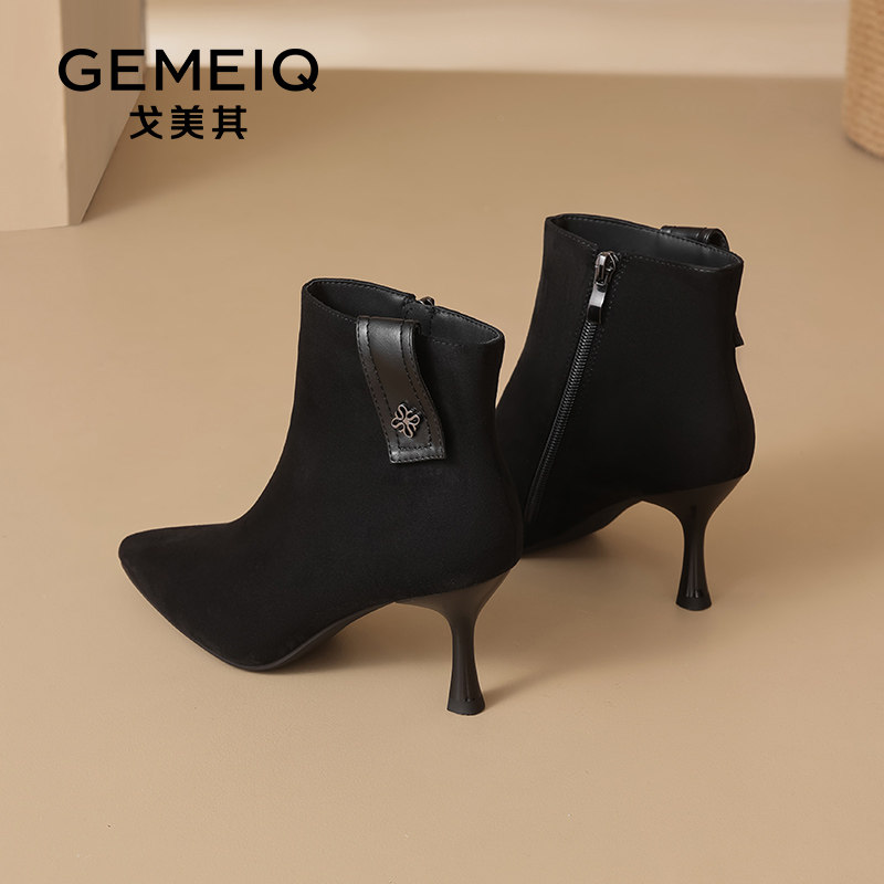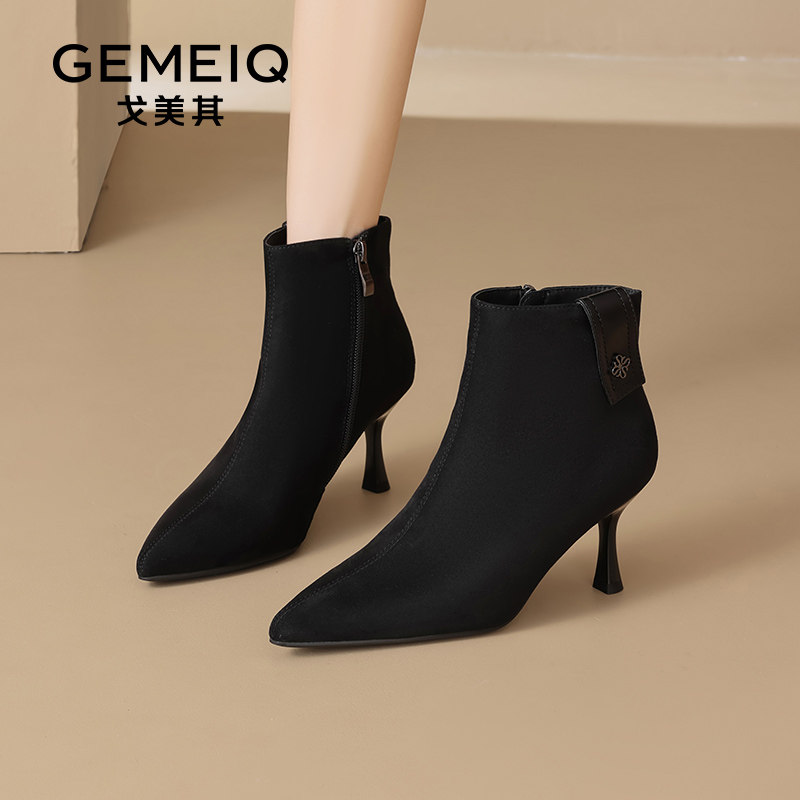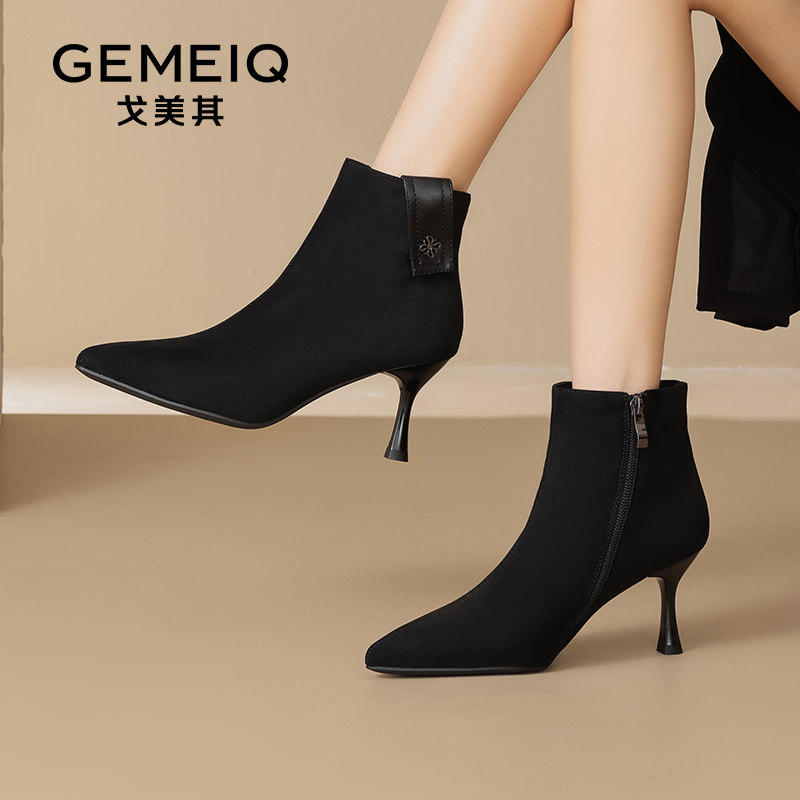 戈美其尖头短靴女高跟袜靴舒适春秋新款单靴细跟绒面弹力瘦瘦靴子