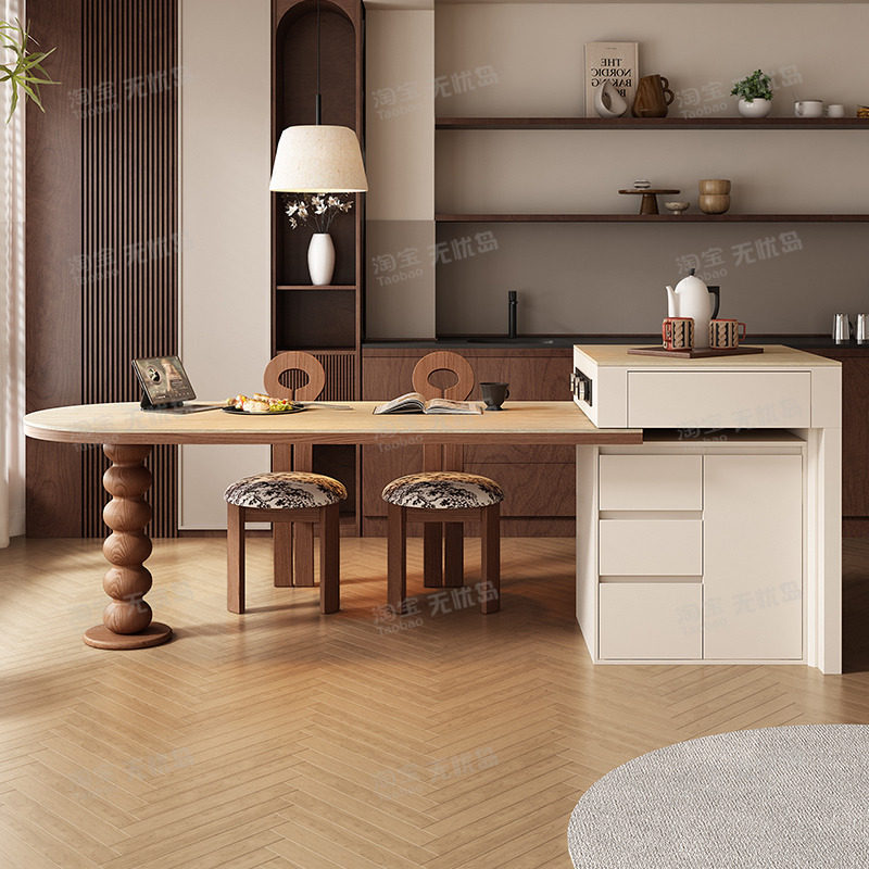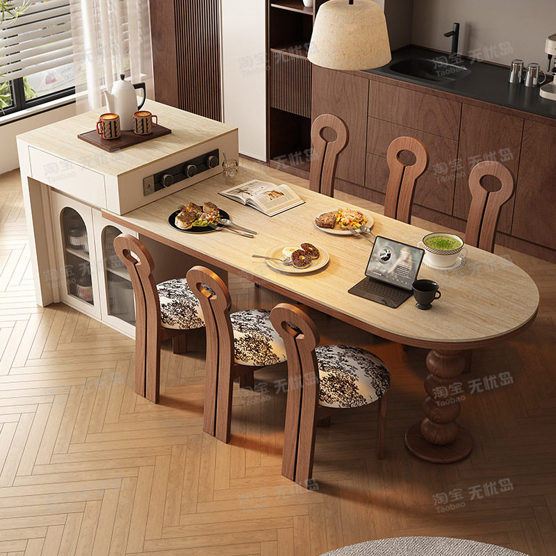 法式中古风岛台餐桌一体式餐厅厨房家用现代伸缩实木岩板岛台餐桌