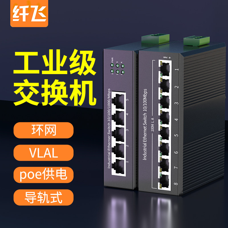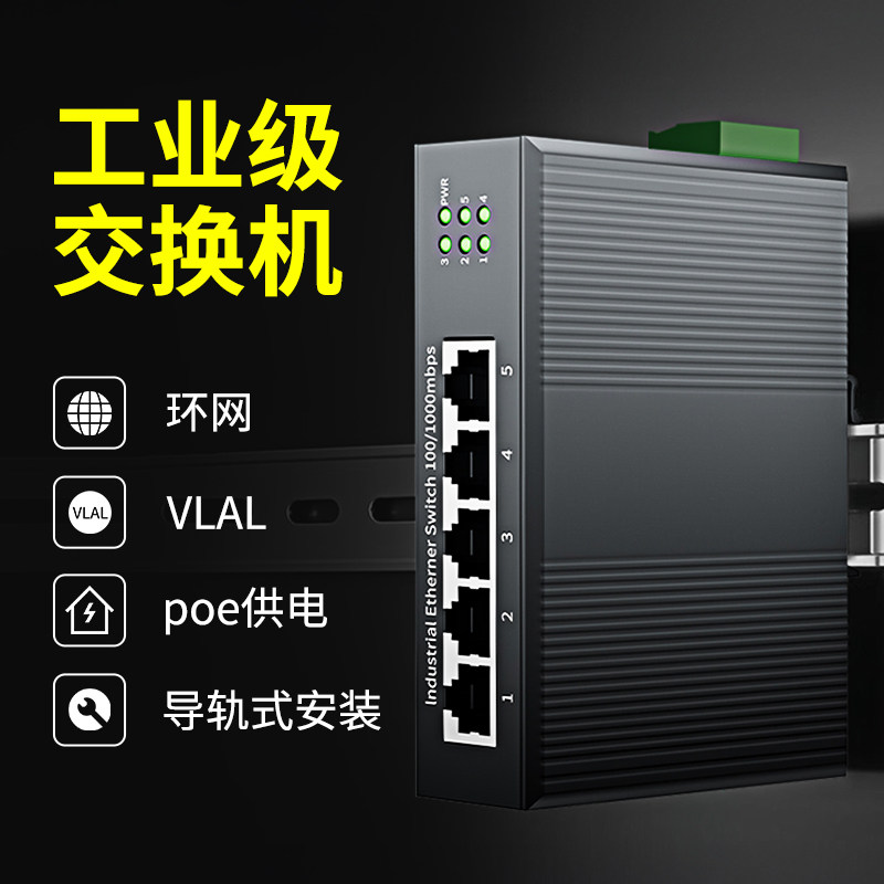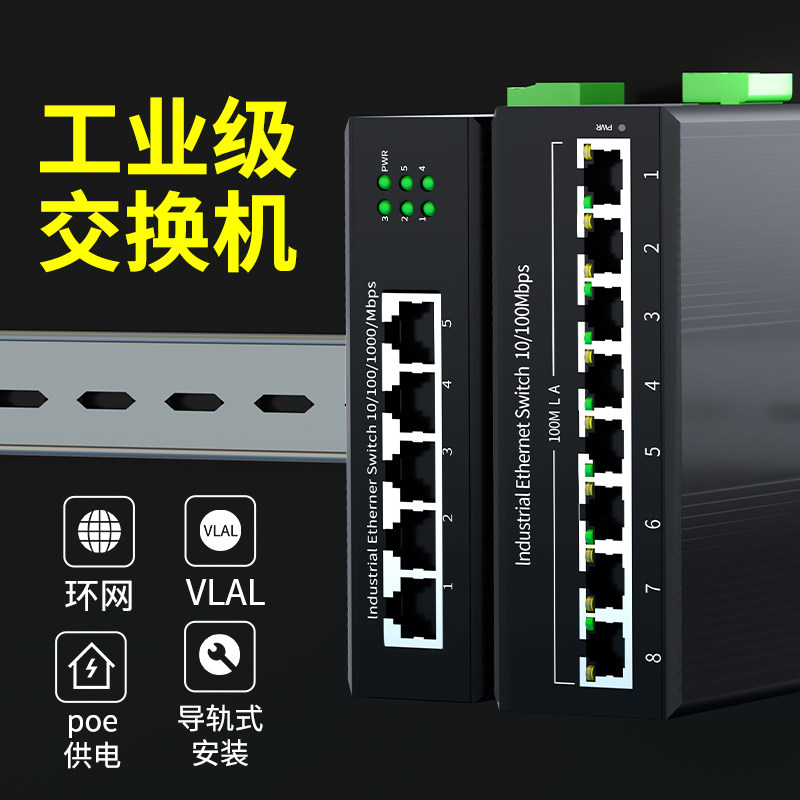 导轨式工业交换机5口/8口 工业级2光4电环网百兆/千兆 PoE供电SFP光口 12V/24V/48V宽压 以太网防雷POE交换机