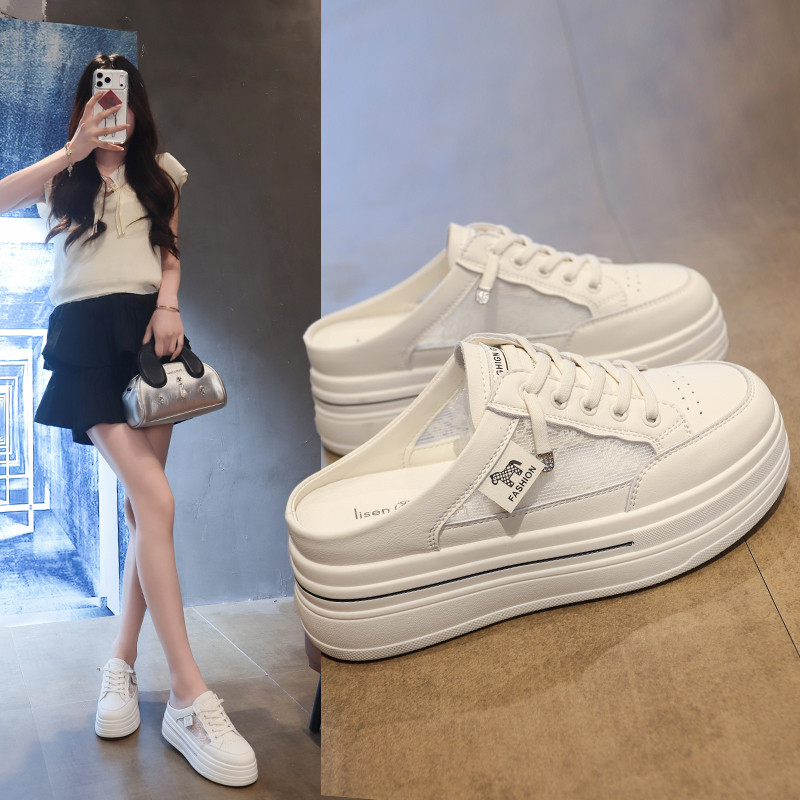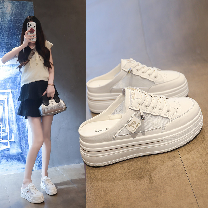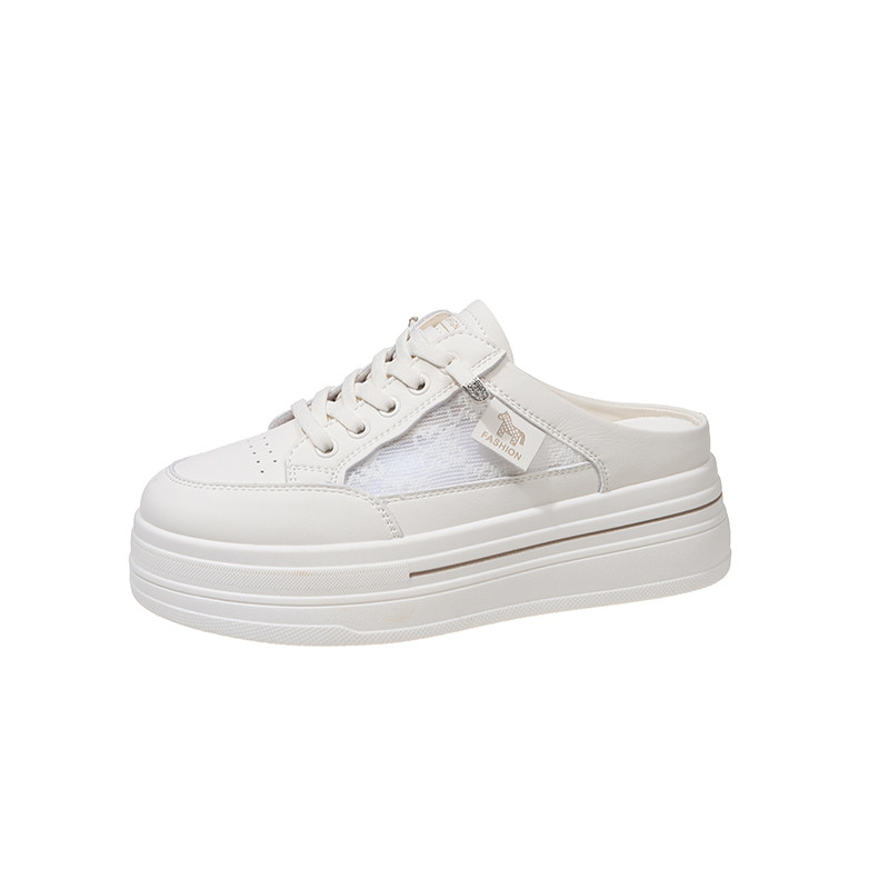 休闲风厚底松糕鞋女白色系带圆头一脚蹬增高小白鞋中跟女鞋纯色夏