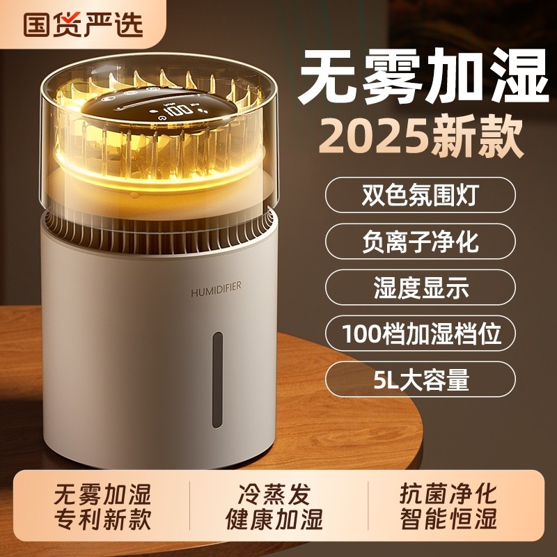 【无雾加湿】2025年新款5L大容量抗菌无雾加湿器卧室空调房母婴级家用办公低噪音冷蒸发一体超长续航不挑水质