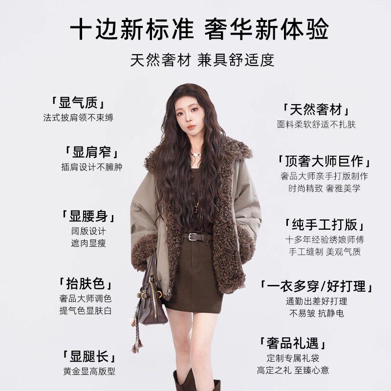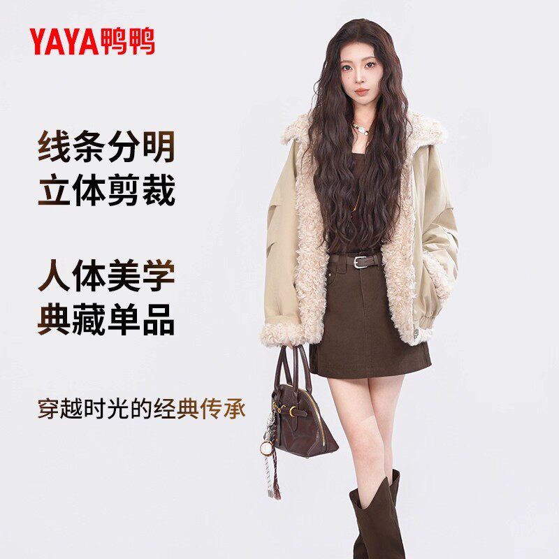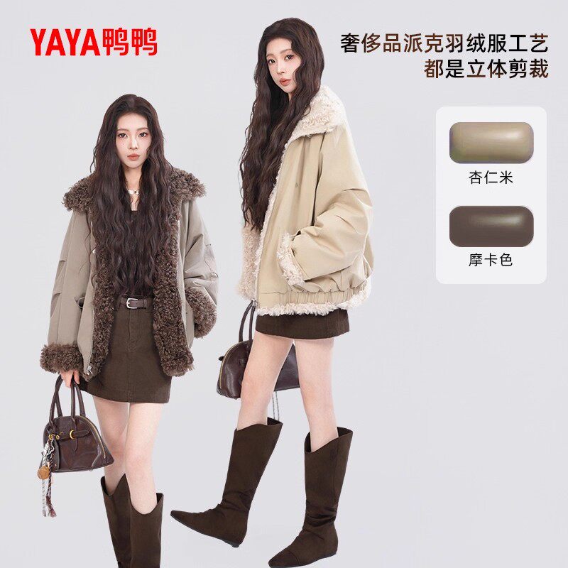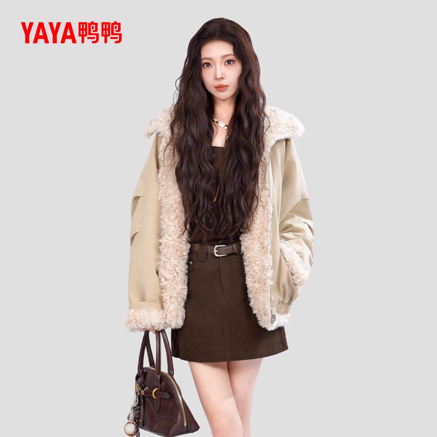 鸭鸭2025年冬季新款羽绒服女羊卷毛毛领气质设计感休闲派克外套F
