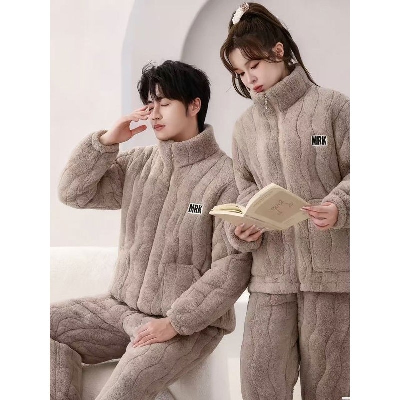 红豆情侣款睡衣女士冬季珊瑚绒加绒加厚套装三层夹棉法兰绒可外穿