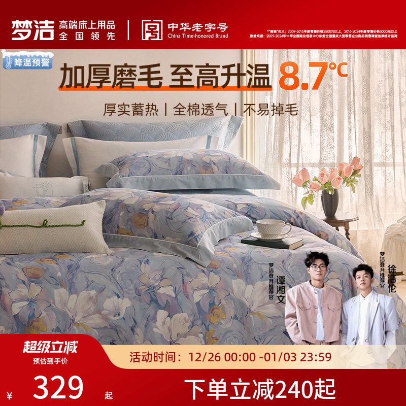 梦洁家纺全棉双面磨毛四件套纯棉保暖套件床品秋冬季床单被套被单