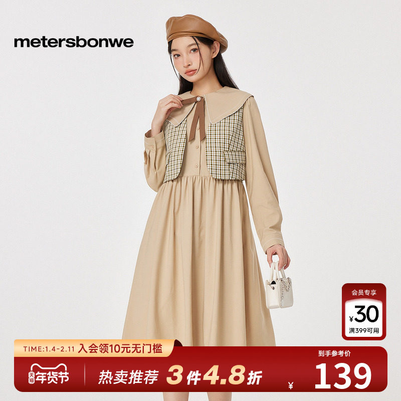 美特斯邦威连衣裙女士春夏新款甜美学院风衬衫式假两件女裙子长裙
