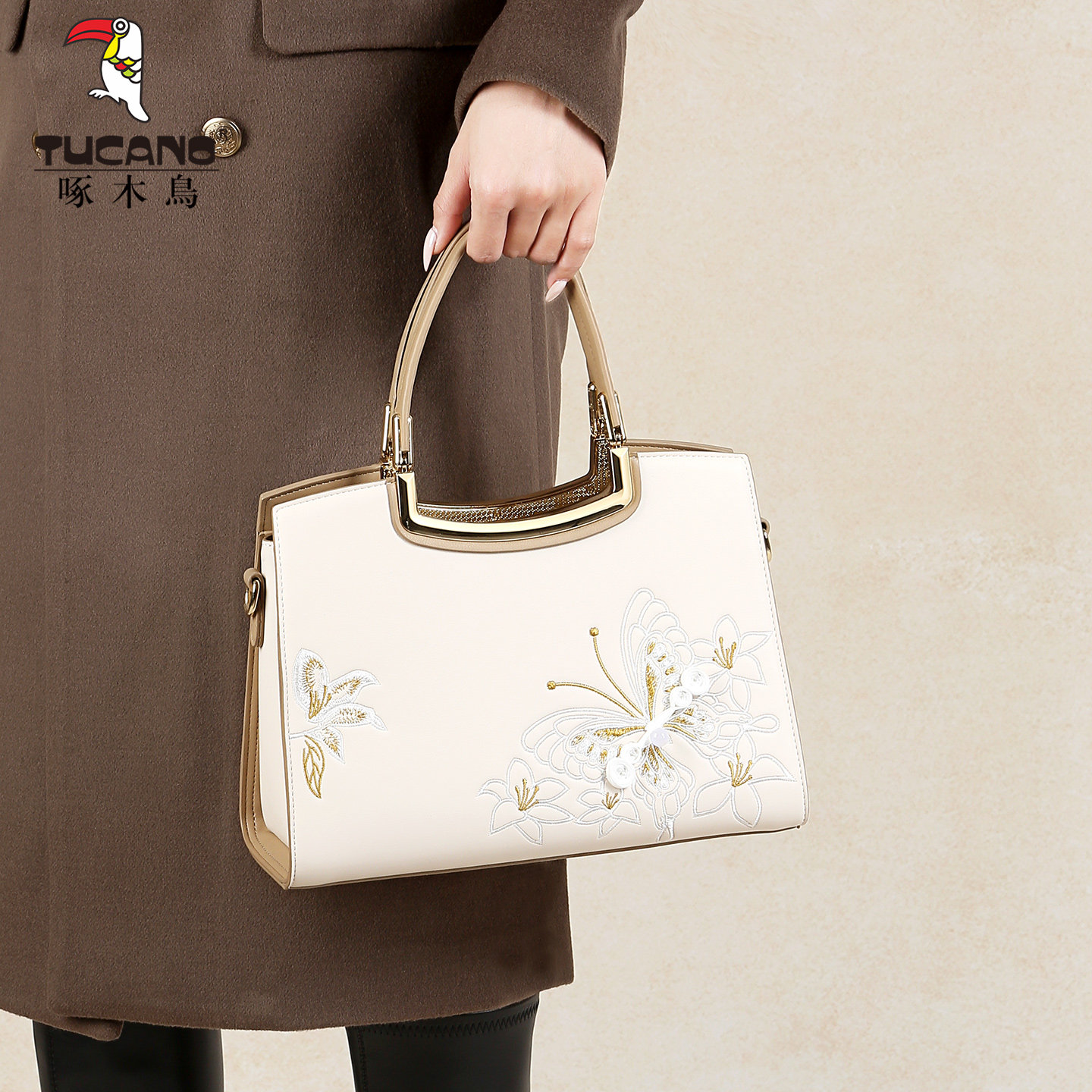 啄木鸟真皮女包2025新款高级质感刺绣中式国风百搭时尚大气手提包