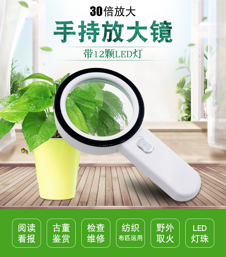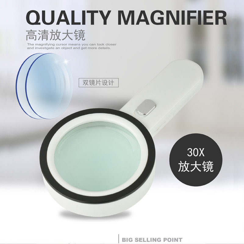 30倍高清手持放大镜 带LED灯老人阅读古董珠宝鉴定手机维修送电池