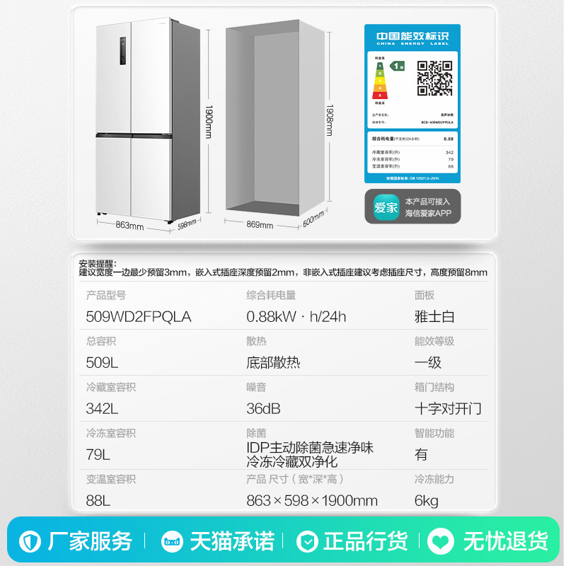 政府补贴海尔出品统帅悦己懒人510十字对开四门超薄一级家用冰箱