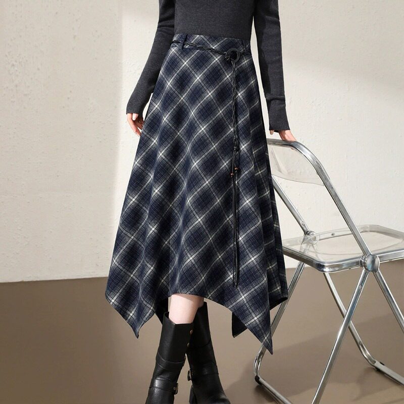 高级感毛呢半身裙秋冬高腰垂感时尚复古中长款A字不规则格子伞裙