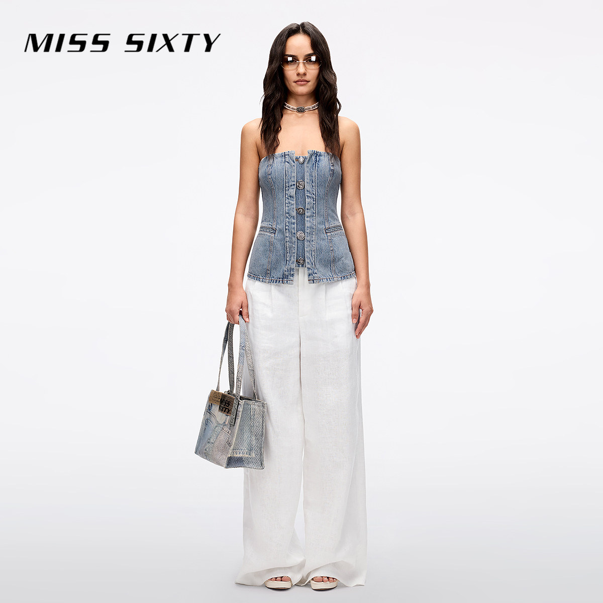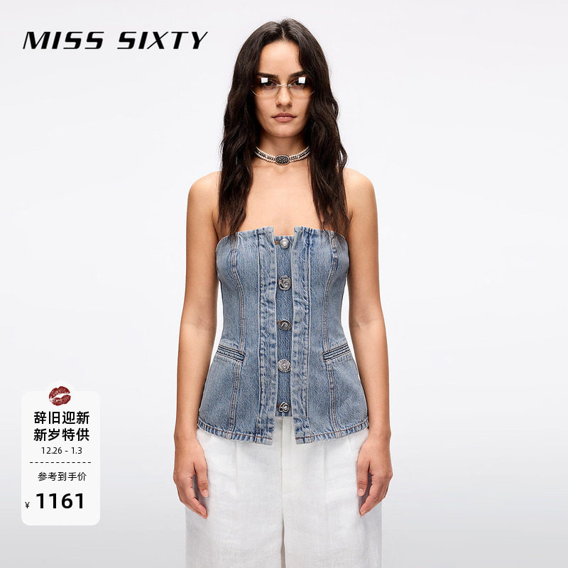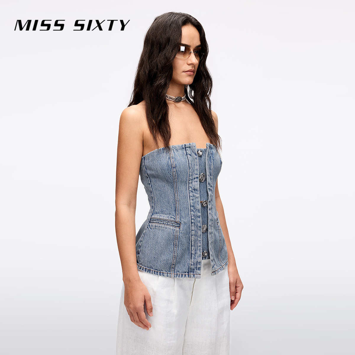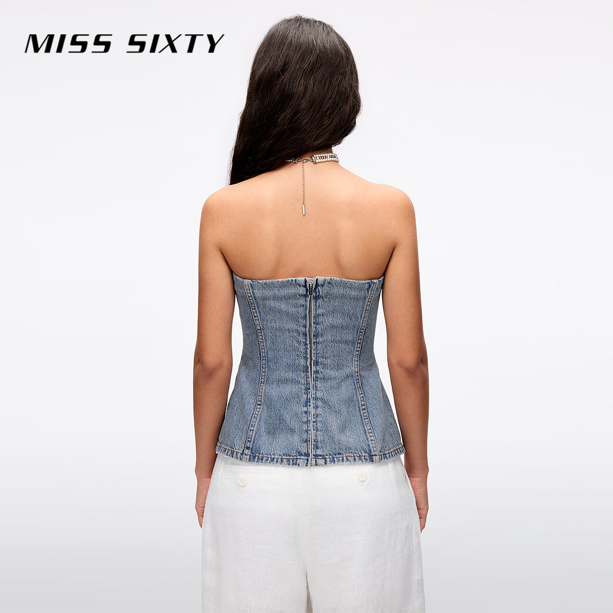 Miss Sixty2025夏季新款牛仔抹胸上衣女修身显瘦性感短款后拉链