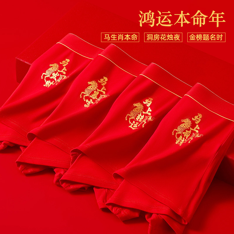 本命年红色内裤男士平角裤纯棉大红色礼物属马年结婚男生四角短裤