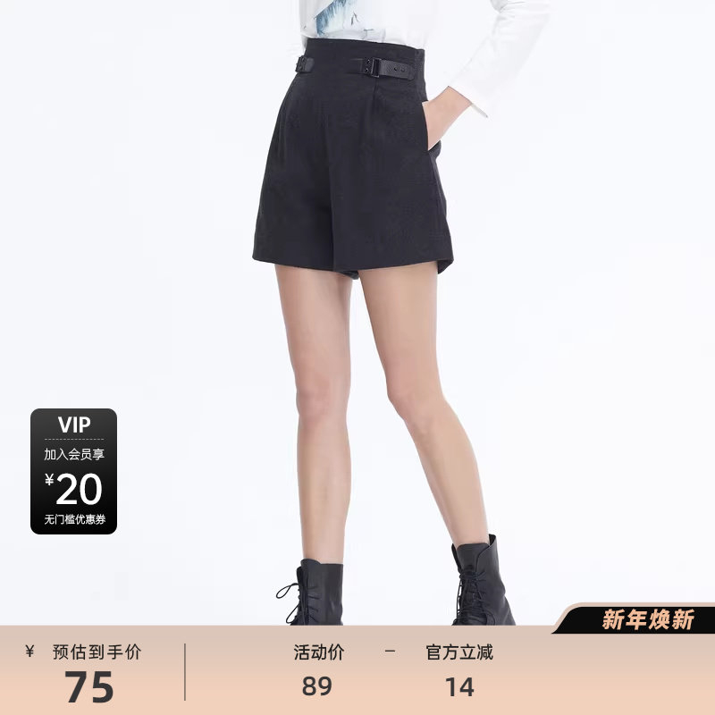 sdeer圣迪奥热裤新品女装时尚皮质拼接毛呢A字短裤女裤S20480902