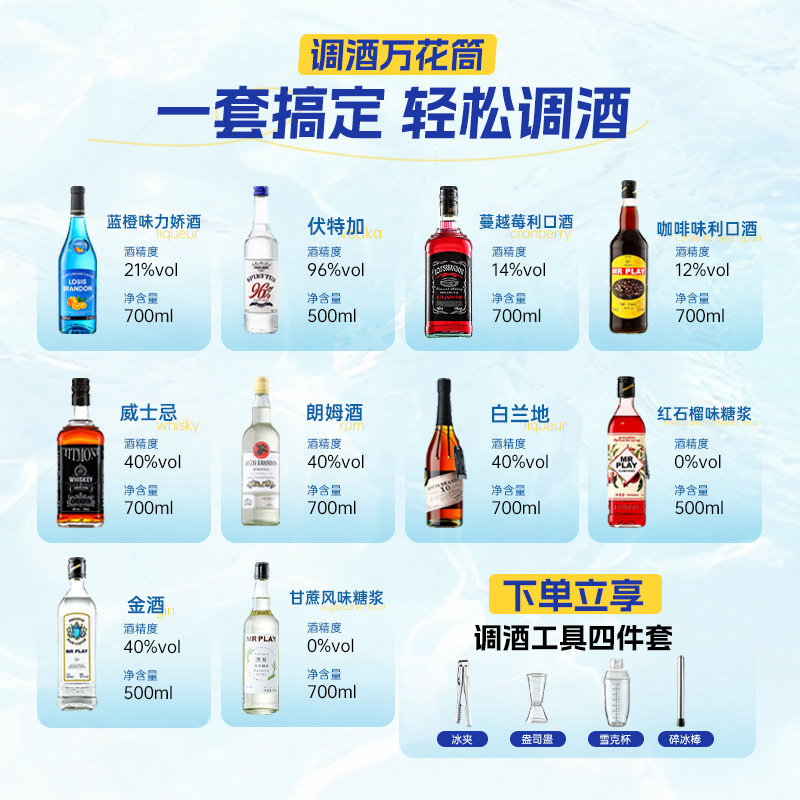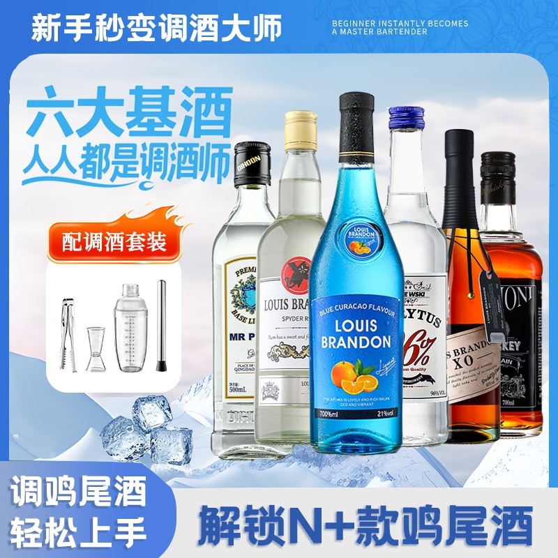 洋酒组合套装调酒基酒威士忌伏特加朗姆酒白兰地金酒蓝橙味力娇酒