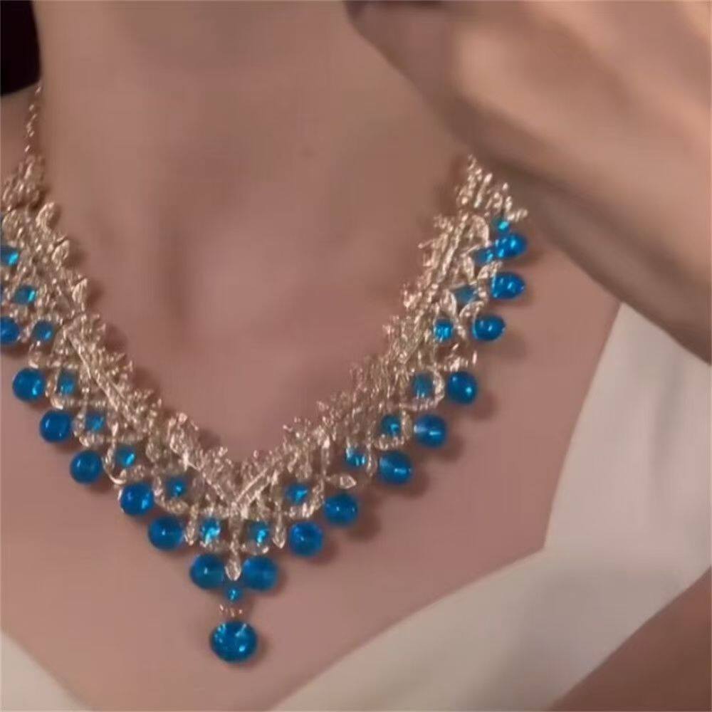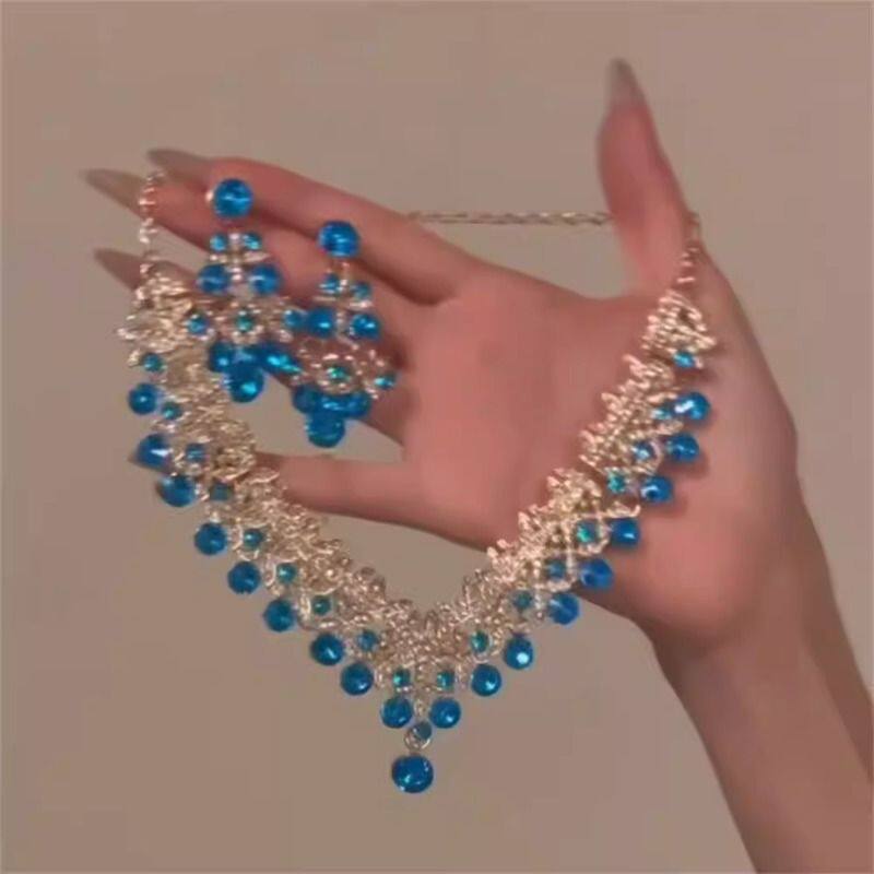 超闪蓝色镶钻项链耳环套装女轻奢气质设计高级感晚宴礼服颈链配饰