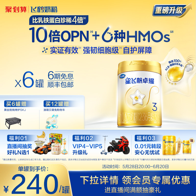 【官方正品】飞鹤星飞帆卓耀A2β酪蛋白奶源3段奶粉750g*6罐5HMOs