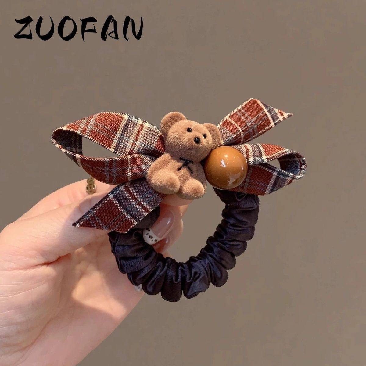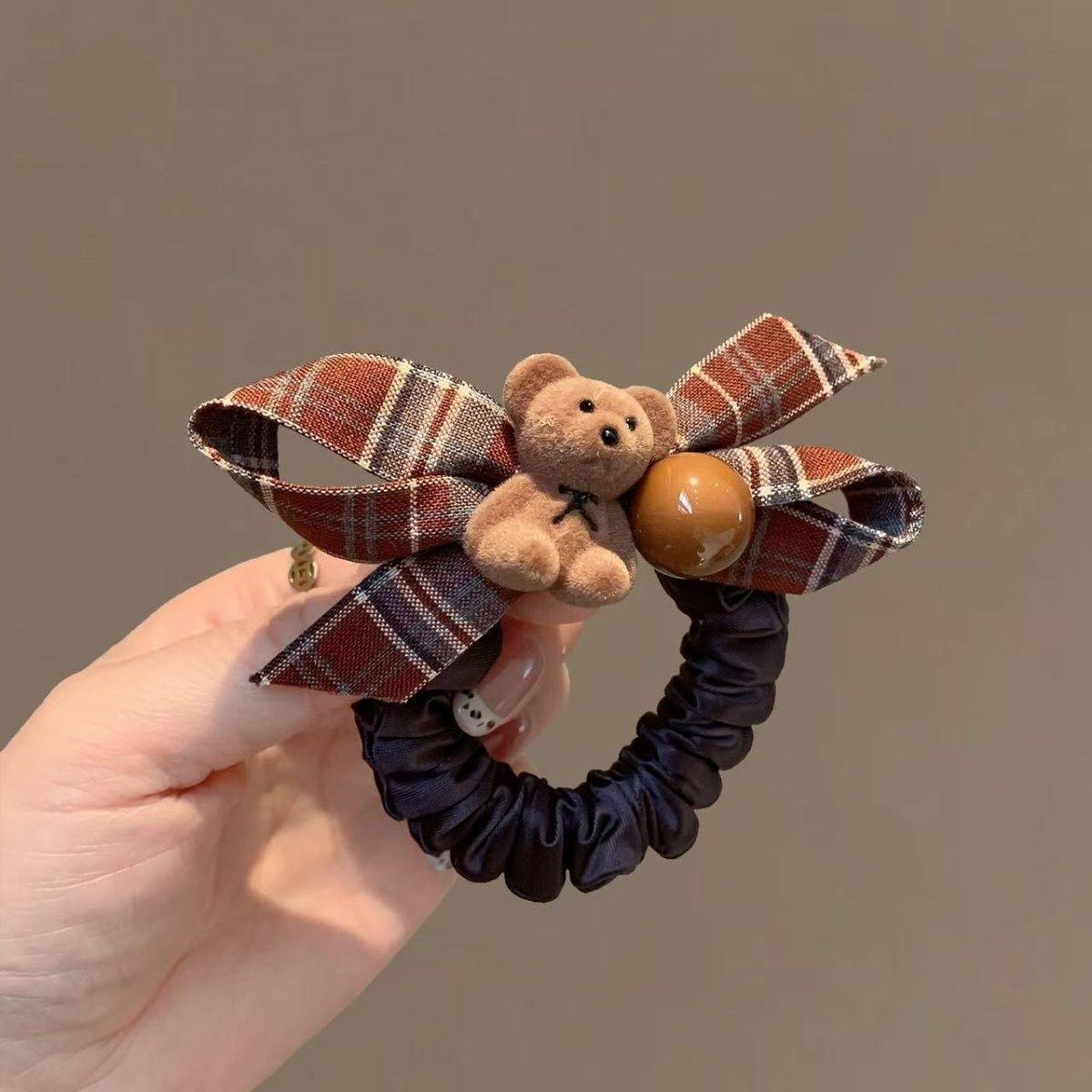 格纹蝴蝶结植绒小熊发圈韩系可爱百搭扎马尾头绳发饰秋冬新款发绳