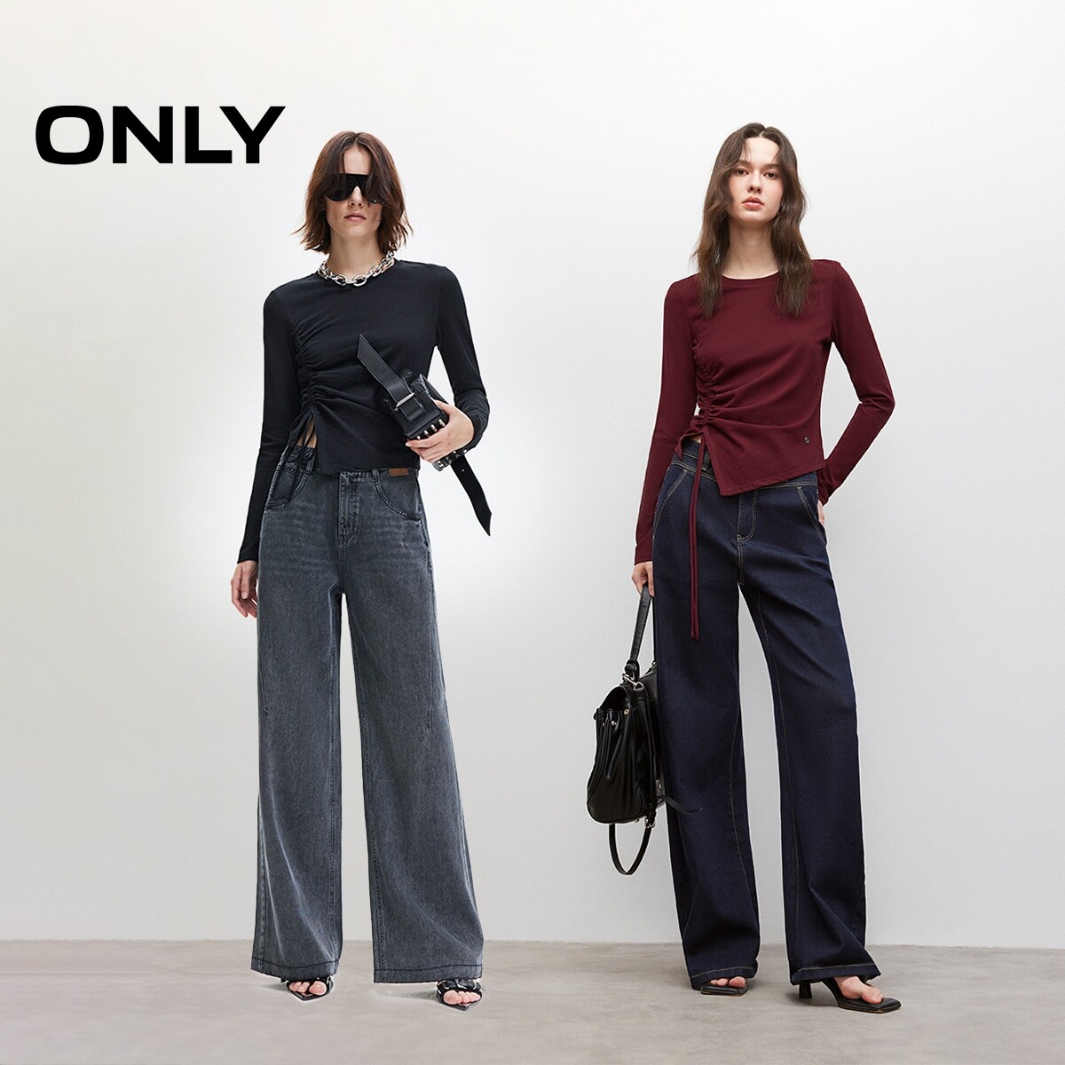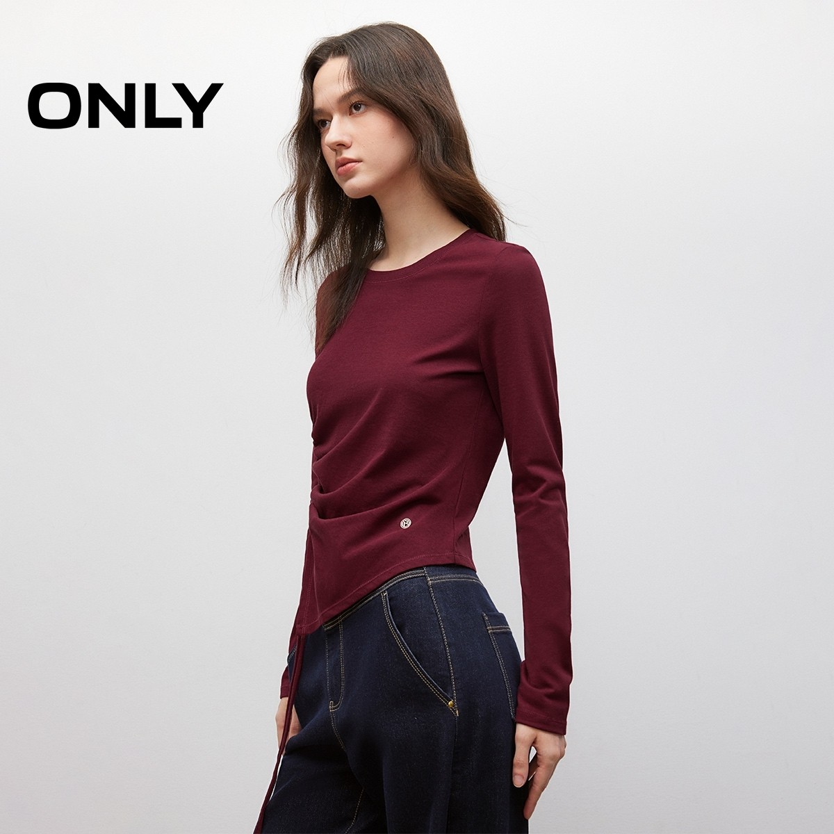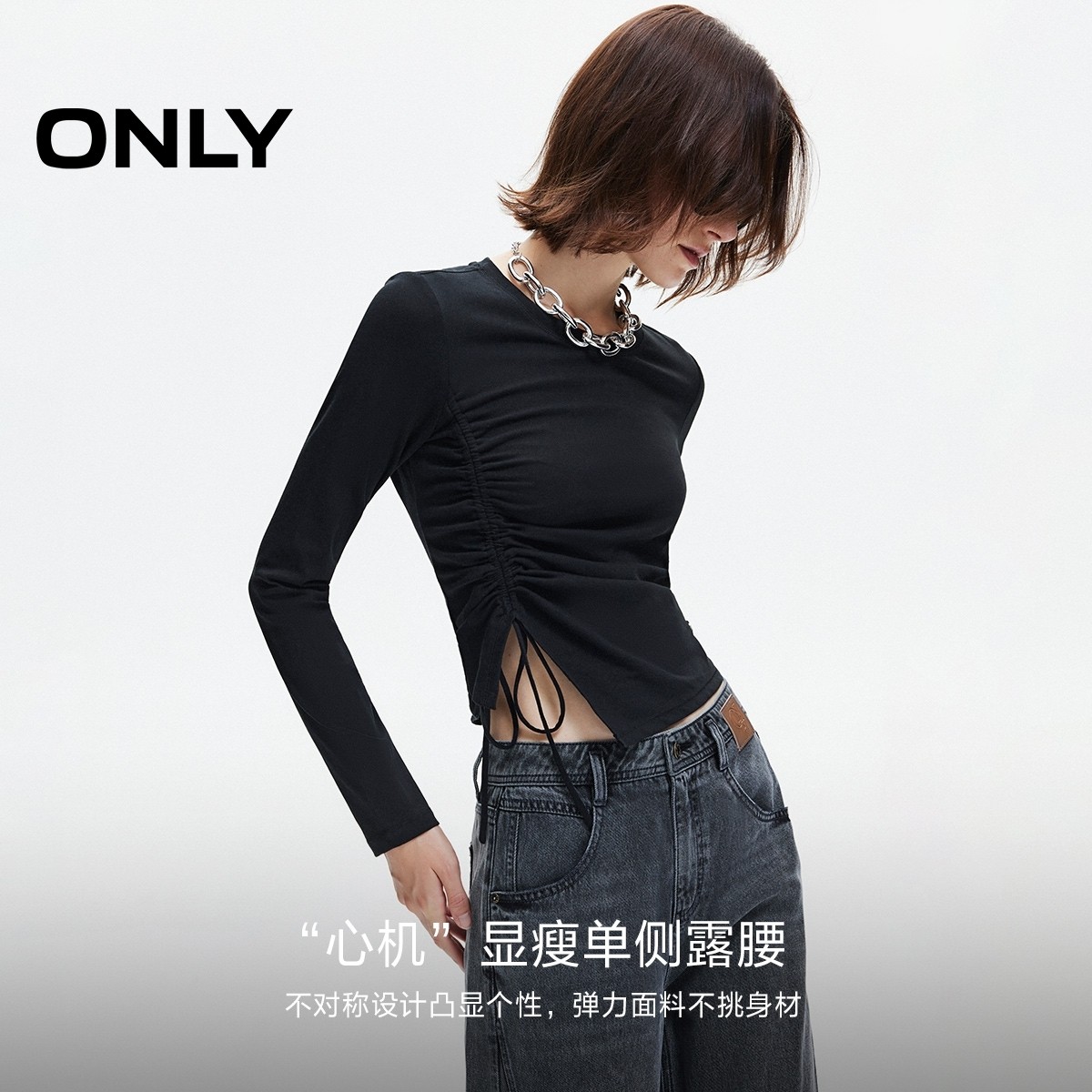 ONLY2025春季新款个性不对称抽绳弹力舒适亲肤正肩长袖上衣T恤女