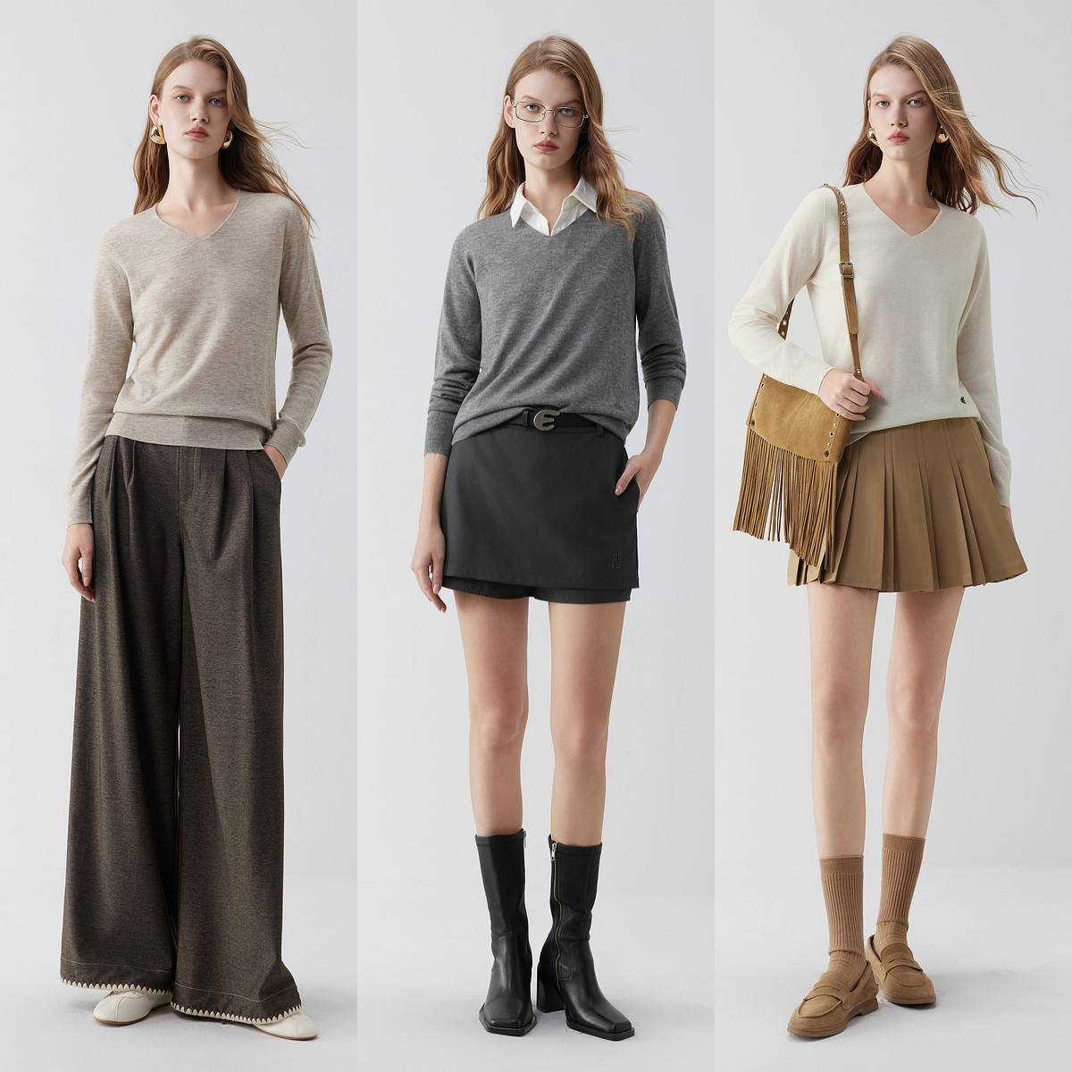 三福长袖上衣2025新款秋季圆领修身针织衫简约纯色内搭打底衫女装