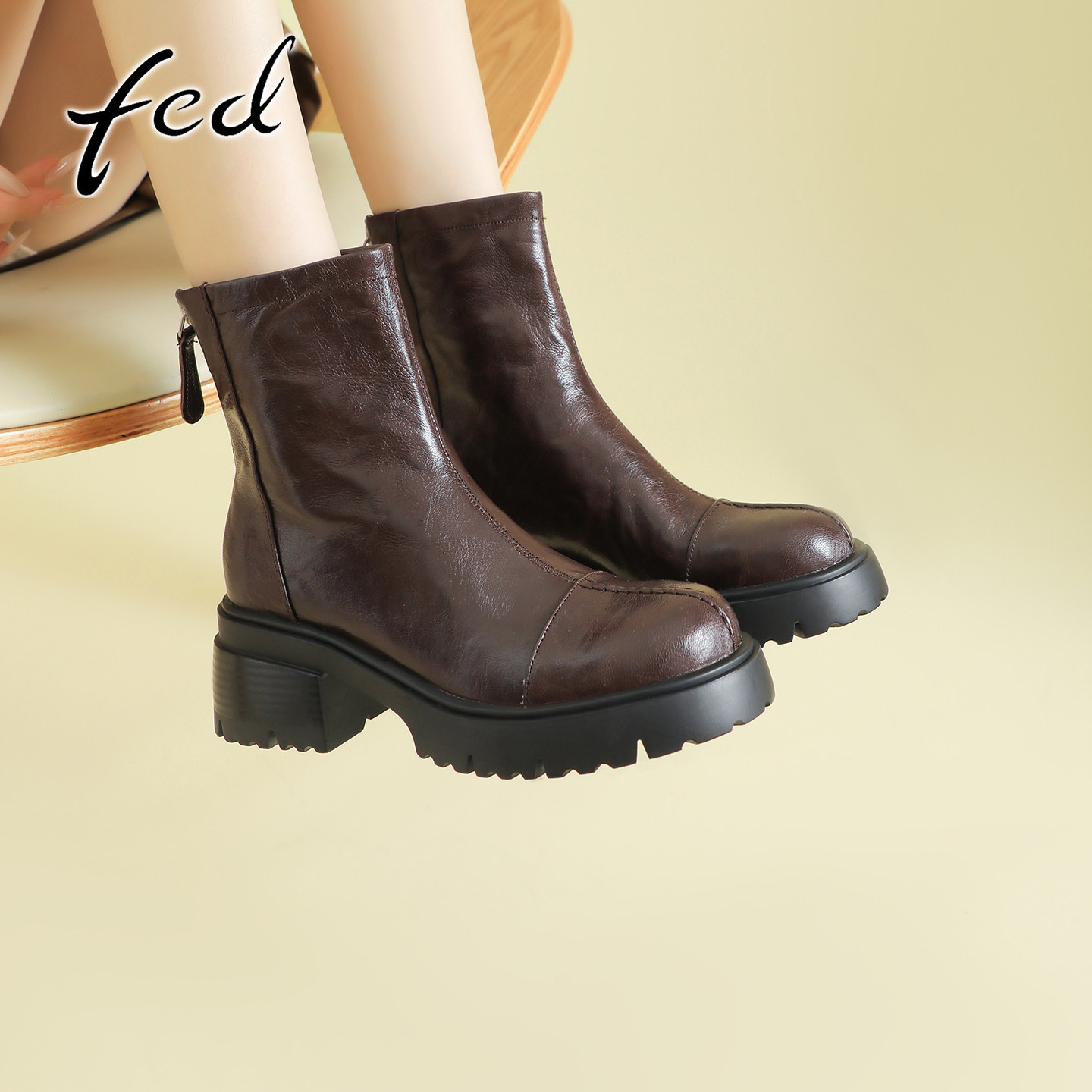 fed复古真皮粗跟厚底马丁靴女秋冬款后拉链气质圆头高跟瘦瘦短靴