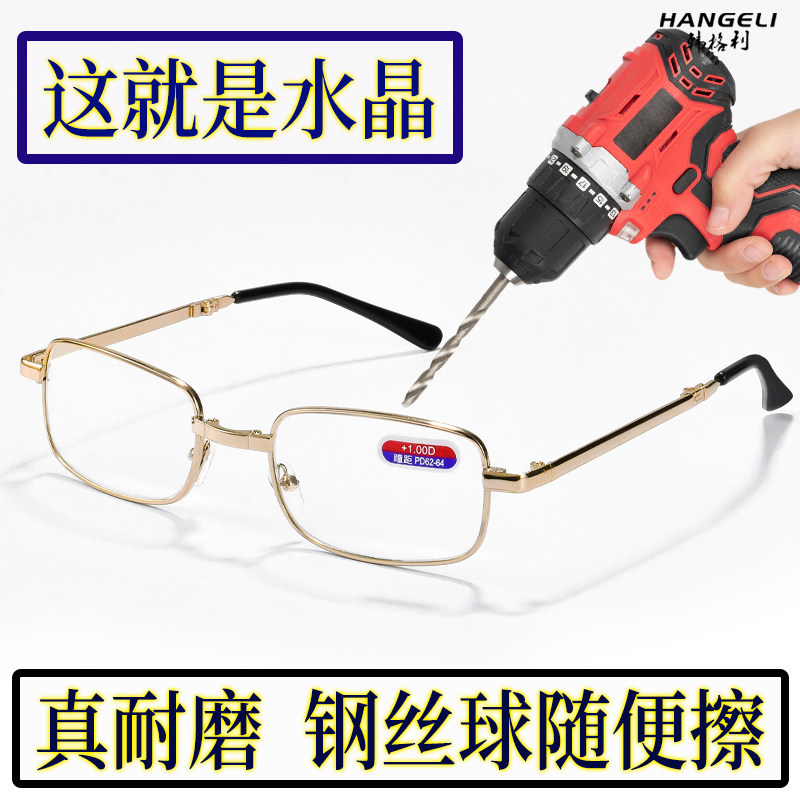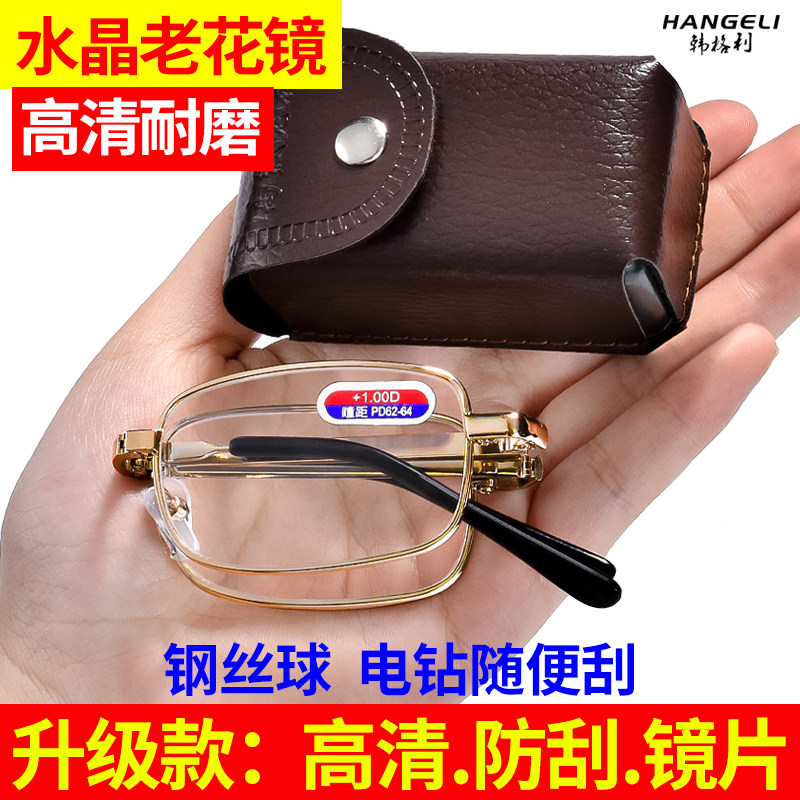 真水晶折叠老花眼镜中老年高清高档玻璃石头老花镜超轻防蓝光镜片