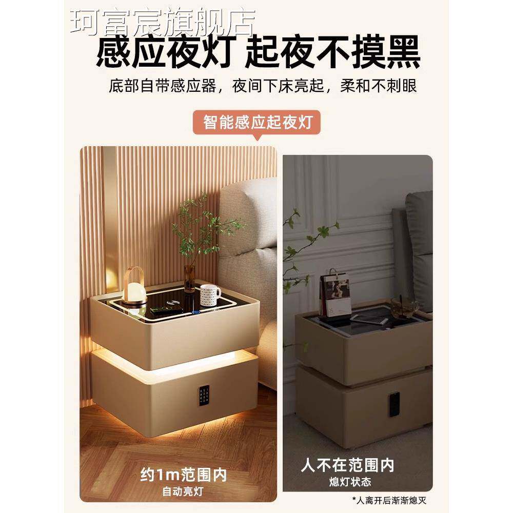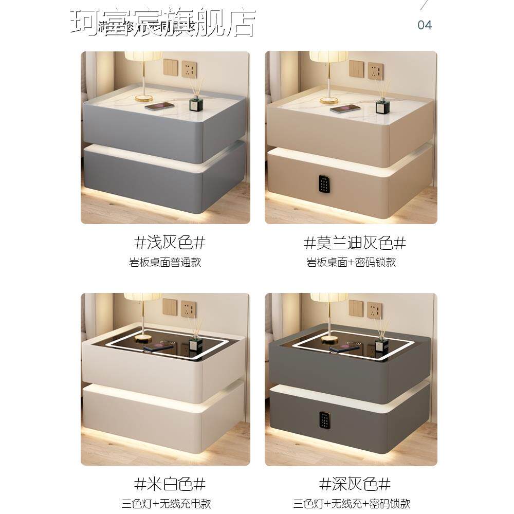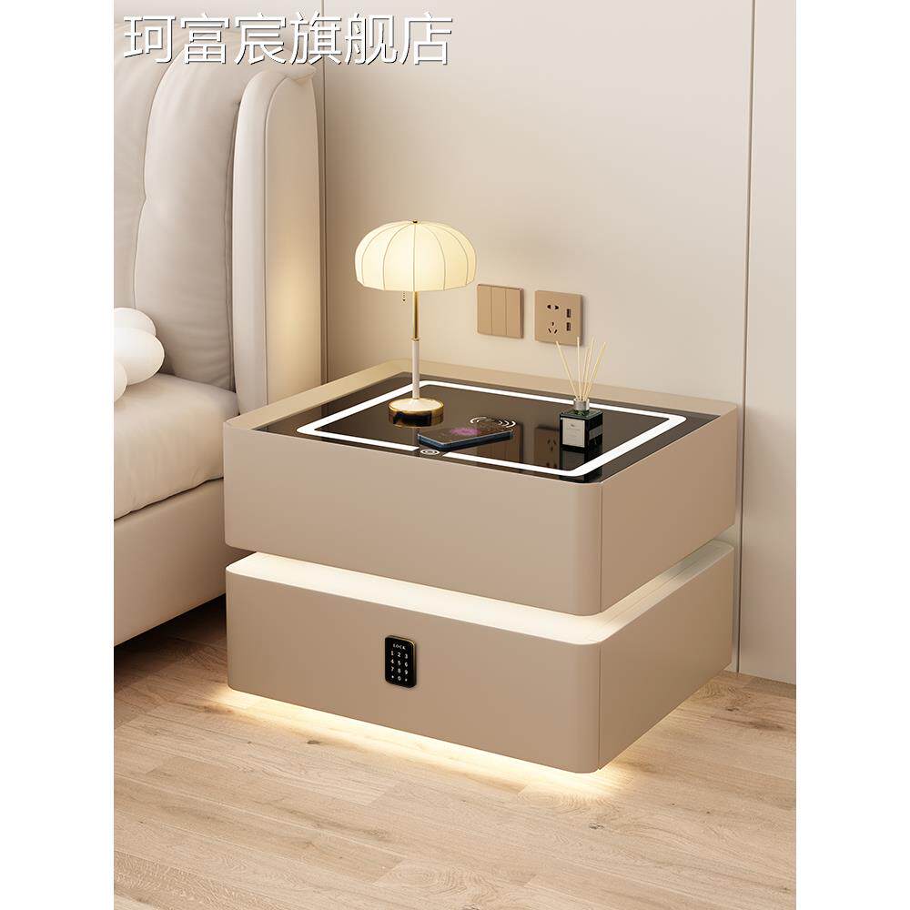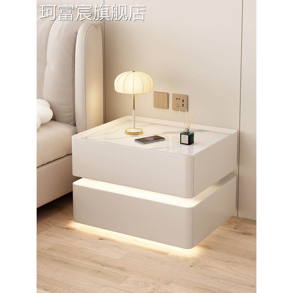 珂富宸实木奶油风智能床头柜简约现代岩板卧室家用轻奢高级免安装床边柜摆件饰品床笠拉车盖布