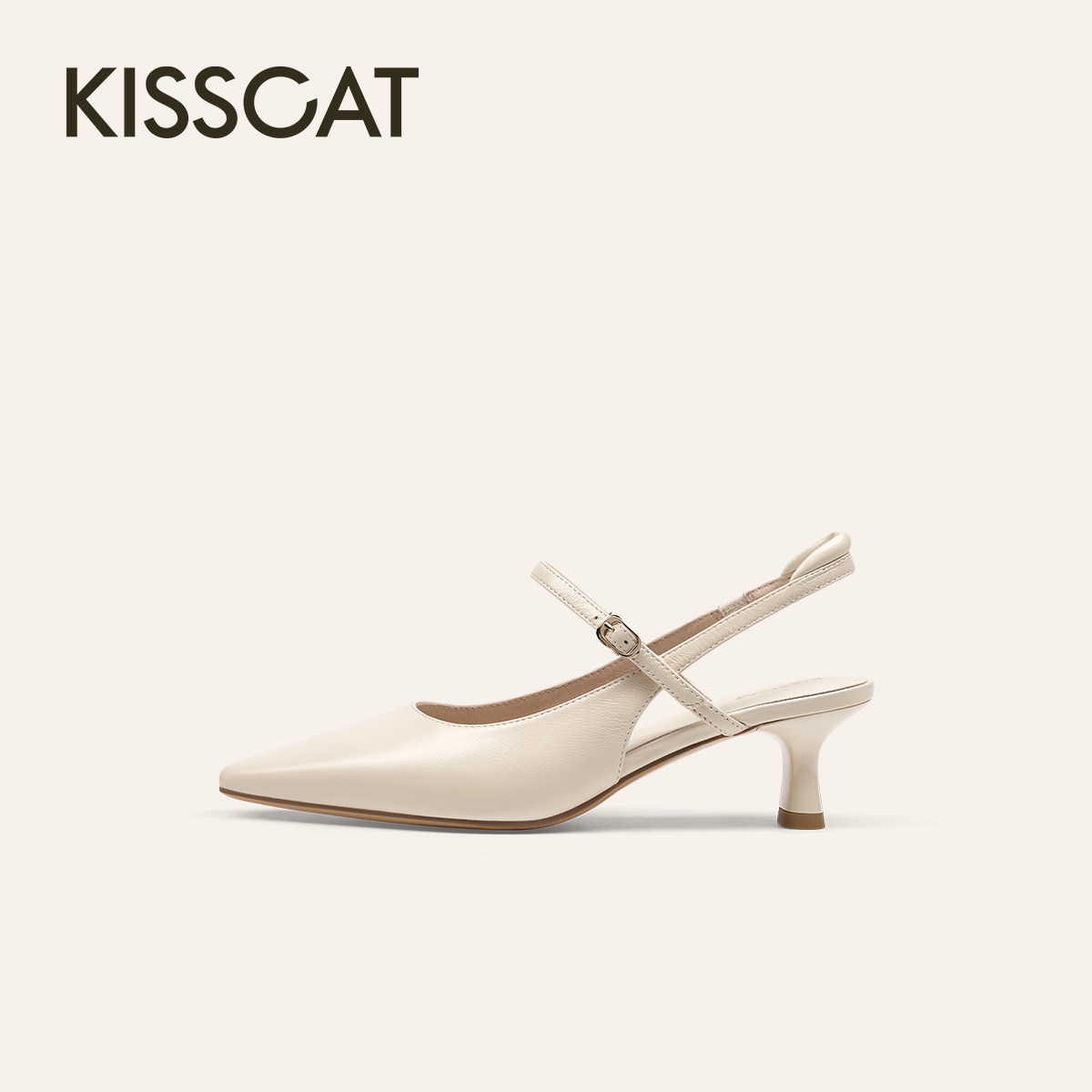 KISSCAT接吻猫春夏季法式尖头羊皮高跟鞋一字带后空玛丽珍凉鞋女