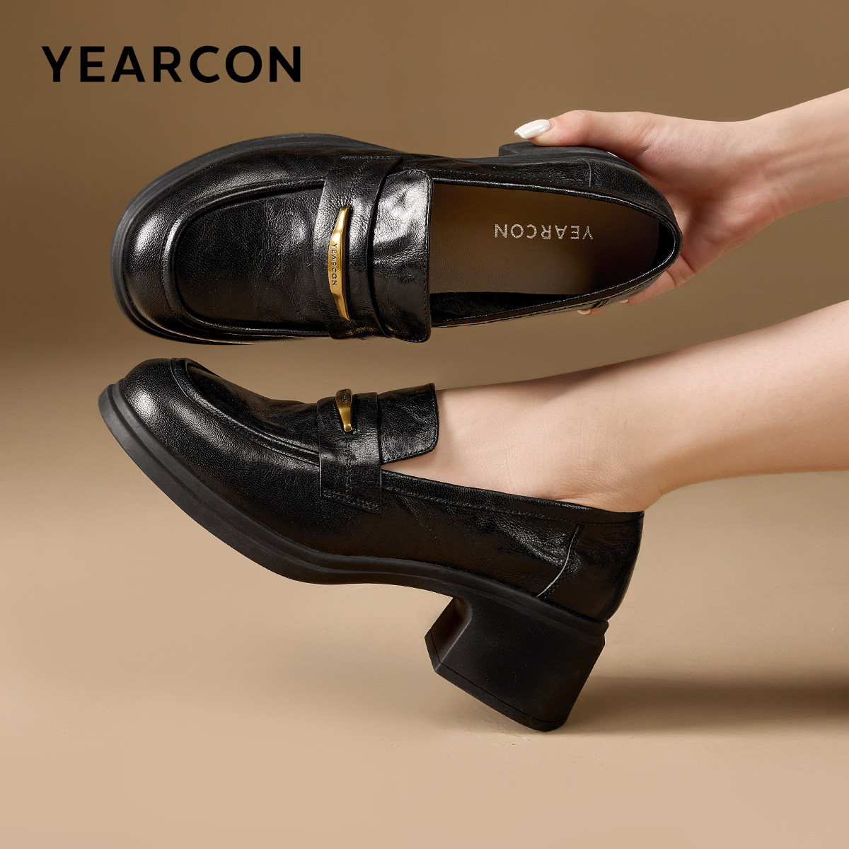 羊皮~棕色山茶花乐福鞋女2025新款通勤粗跟单鞋百搭英伦风小皮鞋